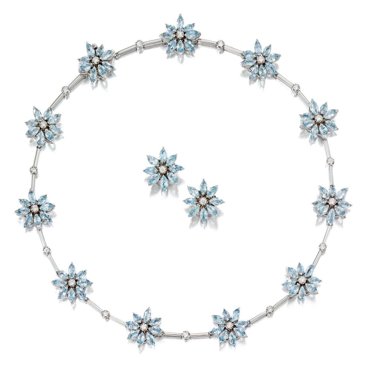 Comprising: a necklace of floral design, set with marquise-shaped blue topaz and brilliant-cut diamonds, length approximately 15 1/4 inches, and a pair of earrings of similar design, length approximately 3/4 inch, post and butterfly fittings, each mounted in 18k white gold, signed Asprey, Italian assay marks.