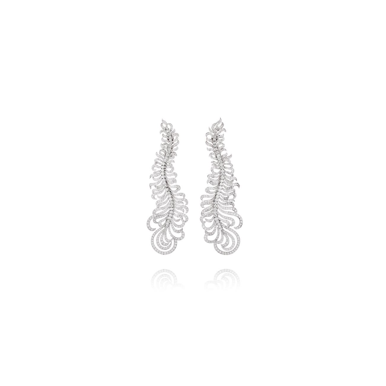 Each designed as an articulated feather motif, set throughout with brilliant-cut diamonds, length approximately 91mm, foldable post and hinged-back fittings, signed Asprey, British hallmarks for gold, box stamped Asprey.