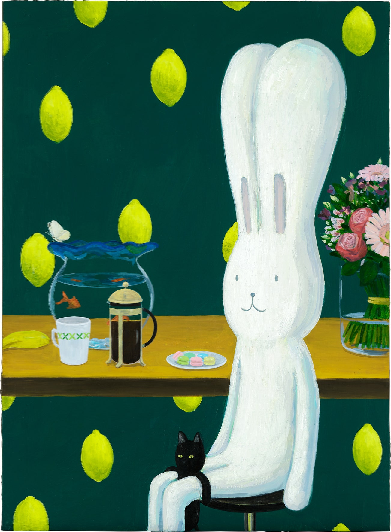 signed, titled and dated '"Lemons, macarons and a black cat" Atsushi 2019' on the reverse