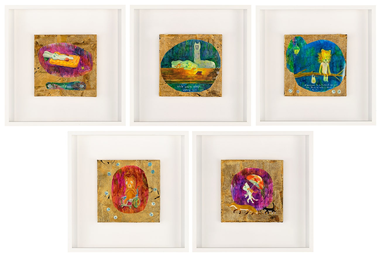 acrylic and imitation gold leaf on MDF, in artist's frame, in 5 parts