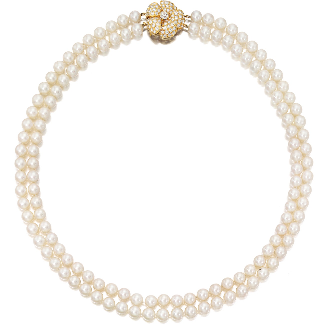 Composed of two strands of cultured pearls measuring 7.80mm to 8.30mm, the clasp of floral motif set with circular- and brilliant-cut diamonds, length approximately 19 inches, mounted in 18k gold, numbered.