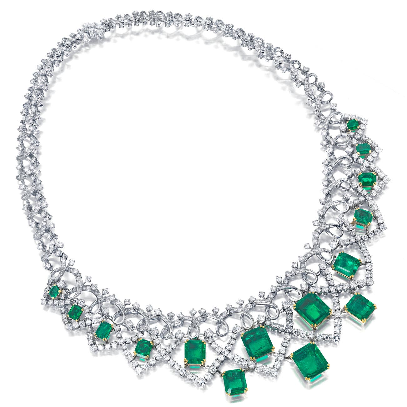 Of openwork design, set with fifteen rectangular and square emeralds weighing a total of approximately 26.0 - 28.0 carats, accented with brilliant-cut diamonds, mounted in 18K white and yellow gold, length approximately 15 1/2 inches.
