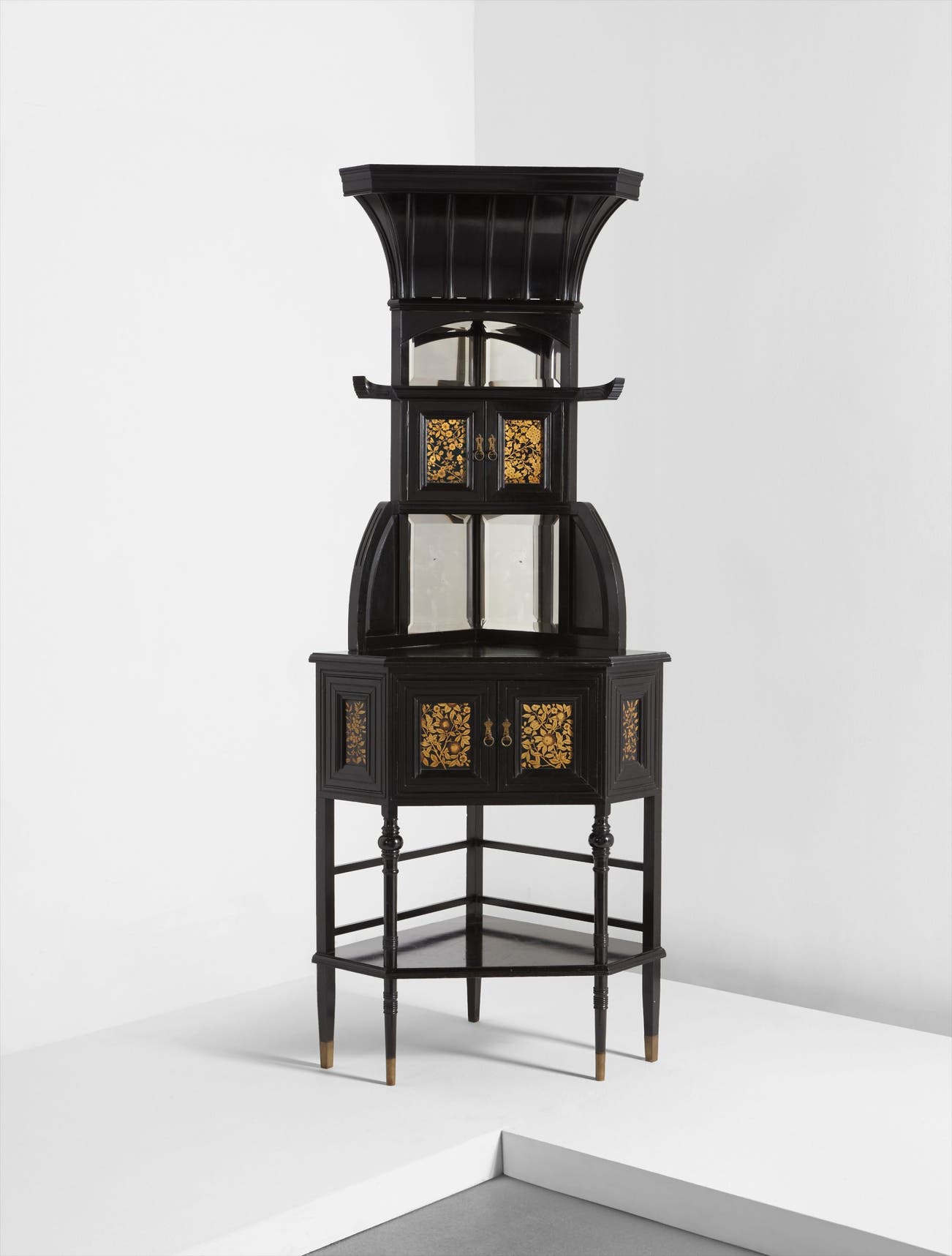 Ebonized mahogany, beveled mirrored glass, inset gilt-decorated panels, brass.