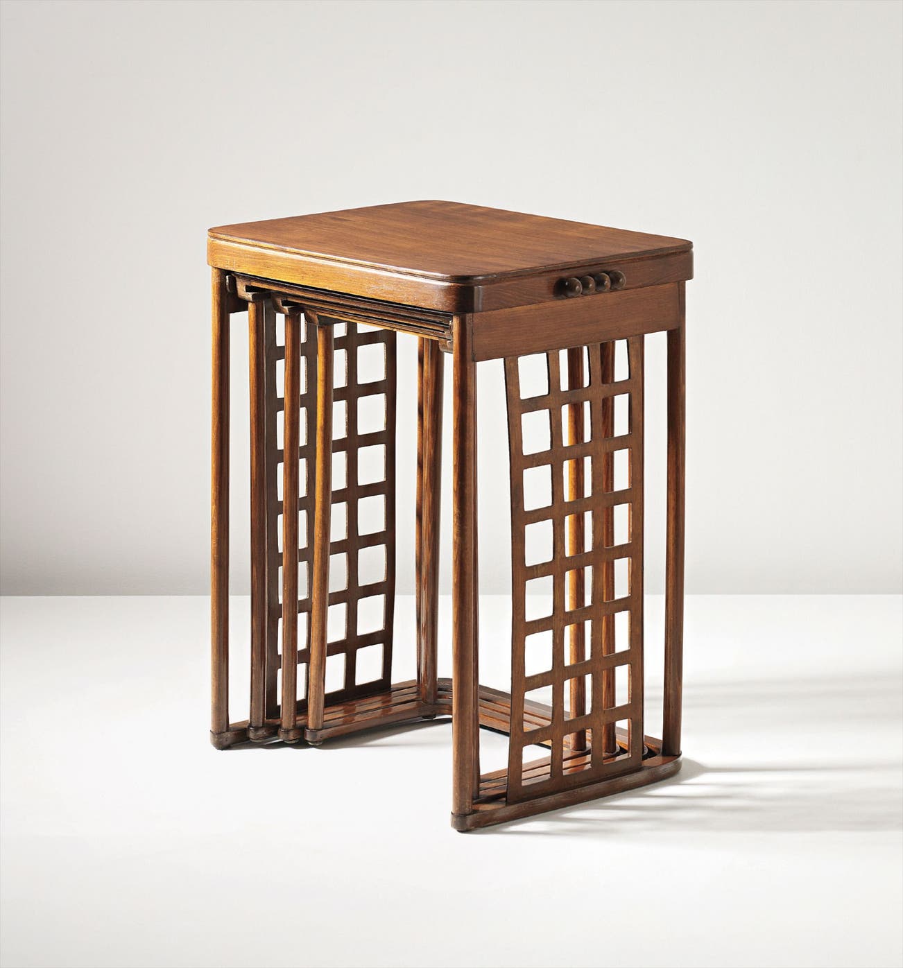 Manufactured by Jacob & Josef Kohn, Austria. Underside of one table with manufacturer's paper label JACOB & JOSEF KOHN, WIEN/REGISTRIRTE/SCHUTZMARKE, and three tables impressed 222.