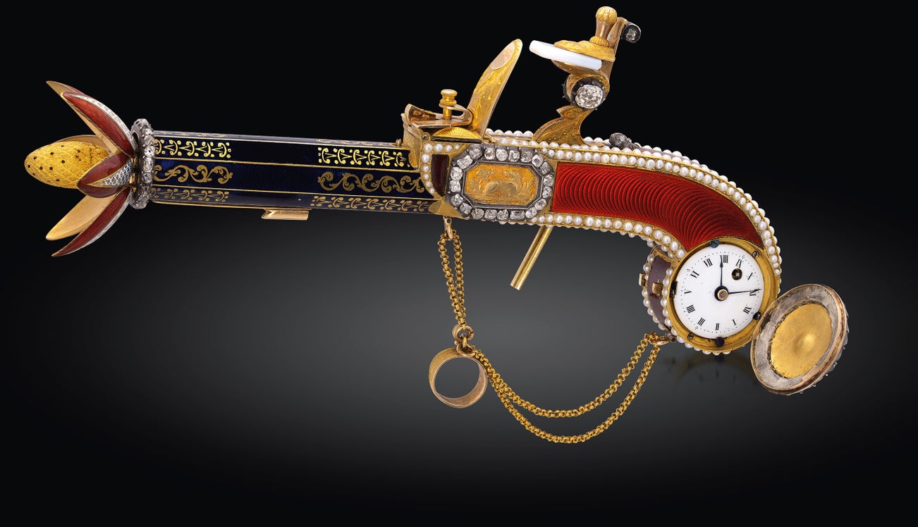 An extremely rare, important and exquisite yellow gold enamel flintlock pistol-form perfume sprinkler with concealed watch, pearls, emerald, opal, diamonds and matching key and associated presentation box, made for the Chinese market