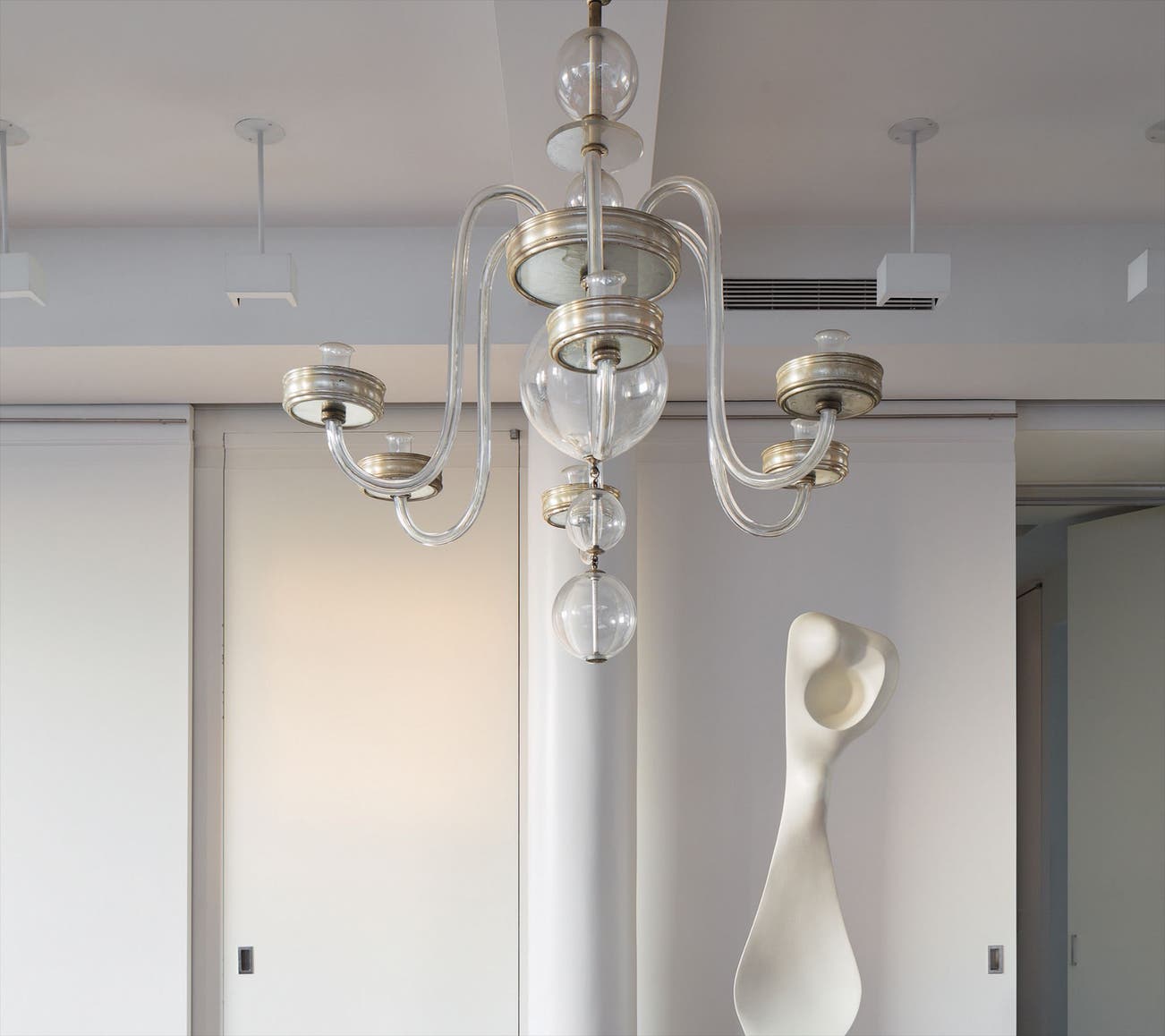 Blown glass, silver-plated metal, foil-backed glass.