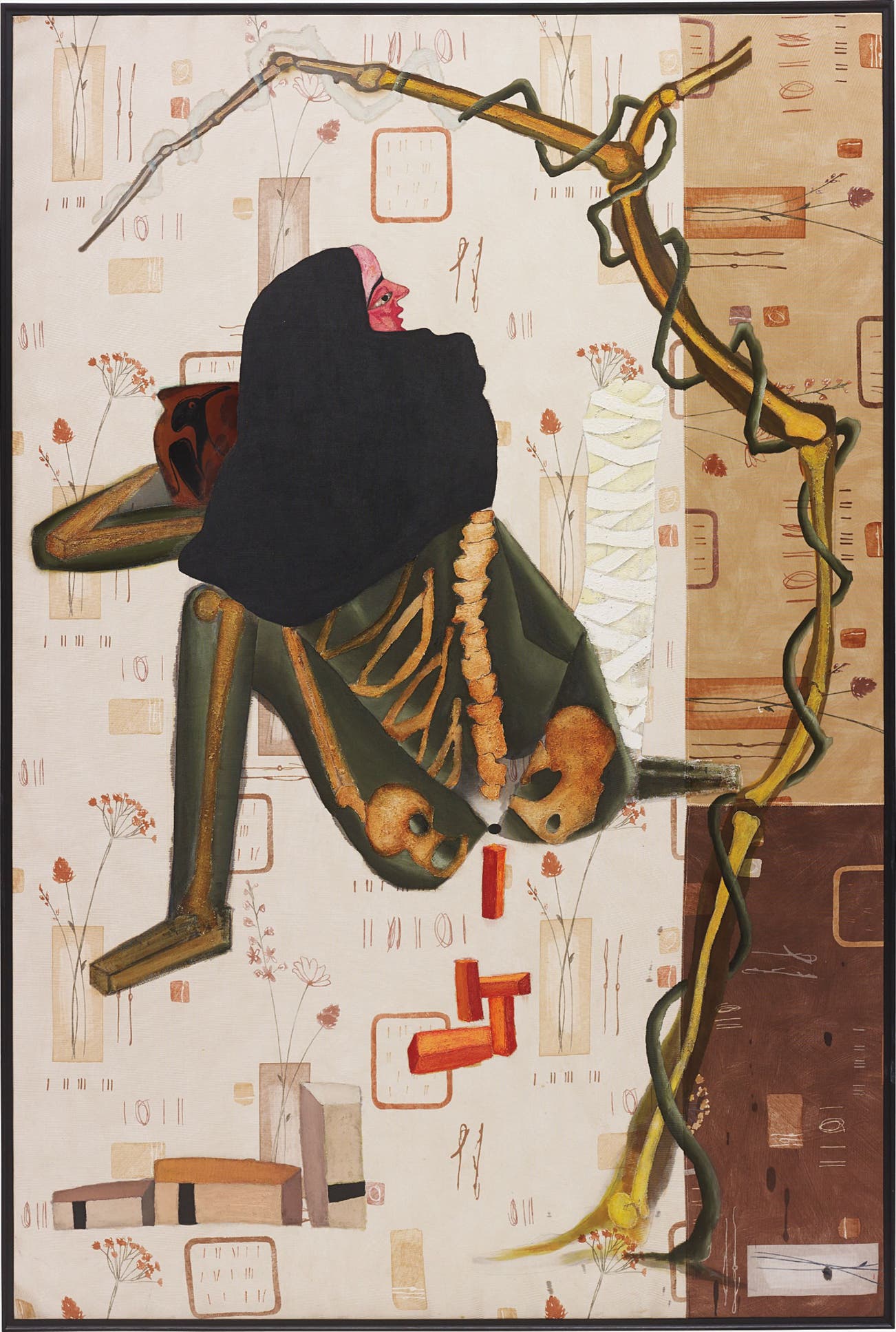 Woman from Kabul is a work about living in Afghanistan at the turn of the new millennium. The artist recalls a country rich in history and resources that has collapsed under the weight of war. A figure of an elderly woman, stripped of most of her black burka, squats over a very decorative backdrop of wall paper. Her body is revealed as skin and bones, representative of the oppression and squalor that has become endemic of the city. Dodiya’s work is a potent reminder of the plight of the refugee.