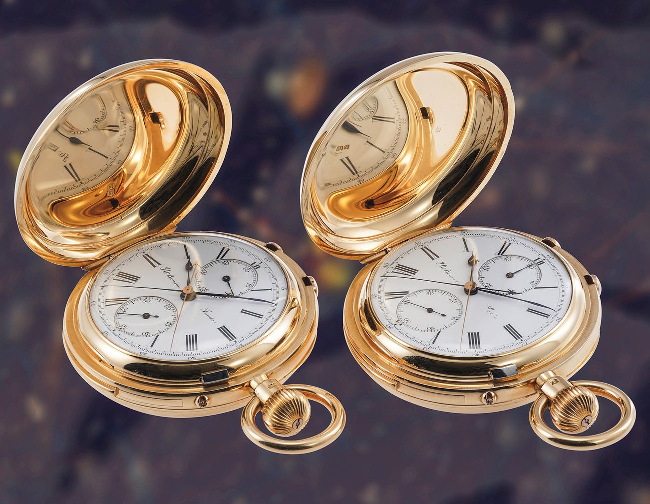 The present pair of heavy hunter case minute repeating split-seconds chronographs represent the epitome of the best quality English watchmaking of the time.