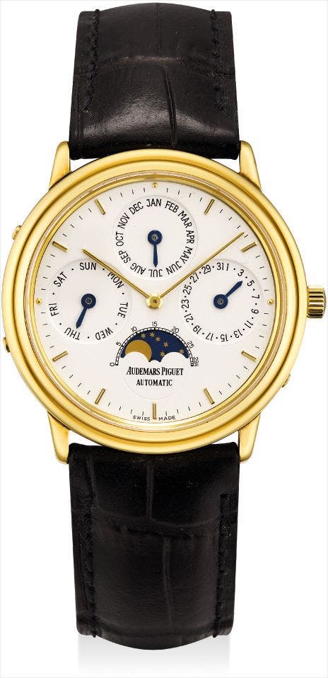 A fine yellow gold perpetual calendar wristwatch with moon phases