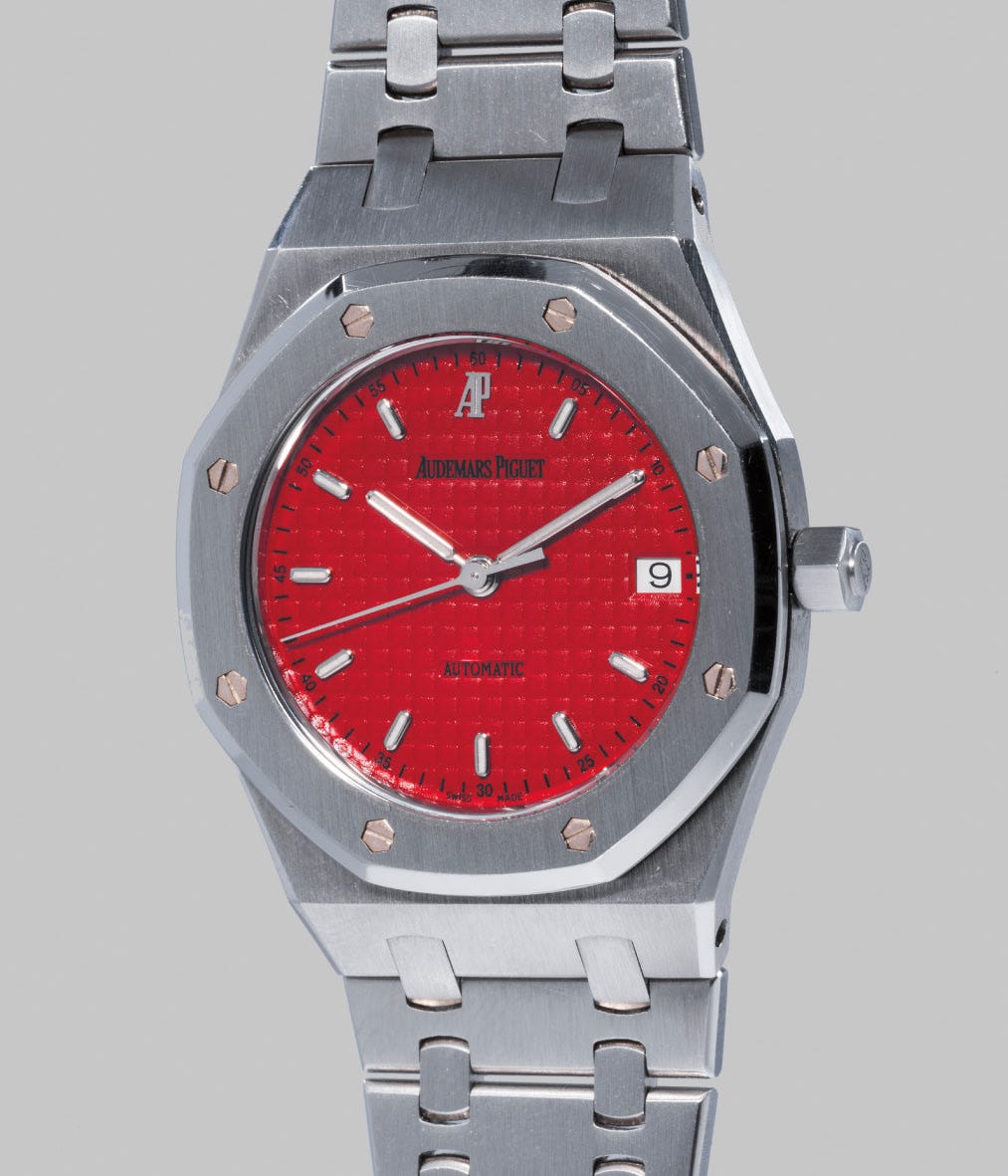 The present watch is a completely novel and interesting interpretation of the Royal Oak. In lieu of the classic ivory or dark colored dial is a "Ferrari" red dial with luminous hands and markers, which is incredibly eye catching and surprising. This watch displays Audemars Piguet's innovative use of color, and the firm's willingness to undertake daring design challenges.