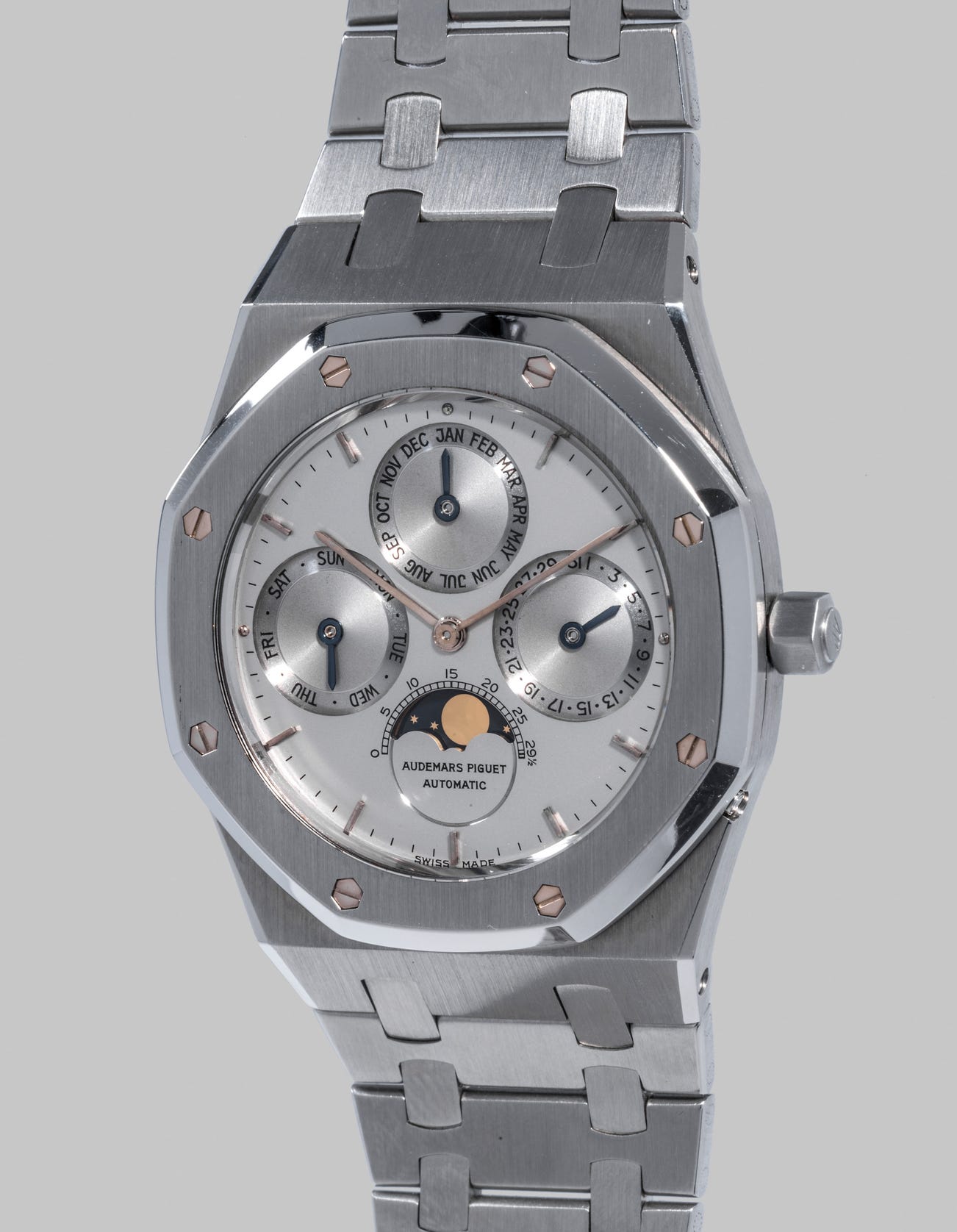 Interestingly, the birth of the Royal Oak Perpetual Calendar is the result of research undertaken by three brilliant watchmakers wishing to create an extra slim perpetual calendar mechanism built upon caliber 2120, which cased other iconic models such as Patek Philippe's Nautilus, Vacheron Constantin's 222 and the Royal Oak itself.