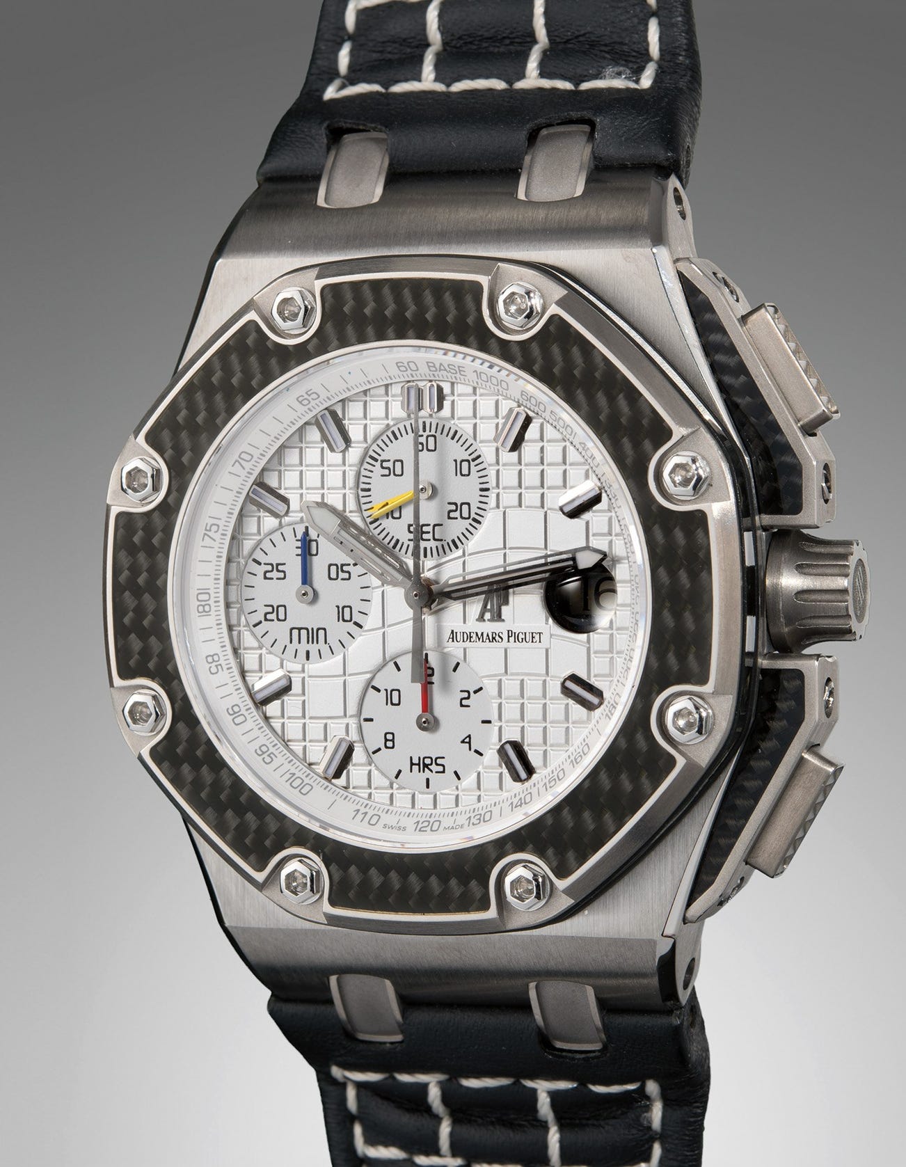 Of course, collectors will know very well the close relationship between motorsports and horology, and with its sportier Royal Oak Offshore line, Audemars Piguet sought to add their name to the list of manufactures devoted to creating watches aligned with racing. The Royal Oak Offshore Limited Edition Juan Pablo Montoya was first released in 2004 in pink gold, platinum, and titanium. The titanium version was released in a limited series of one thousand. It’s a noteworthy model as it was the first significant departure from the design of the earliest Offshores, with its more aggressively-styled rectangular pushers and use of an exhibition caseback for the first time. Early Offshores can be especially recognized by their smaller, round chronograph pushers coated in a fire-resistant elastomer called "therban" that closely resembles rubber.