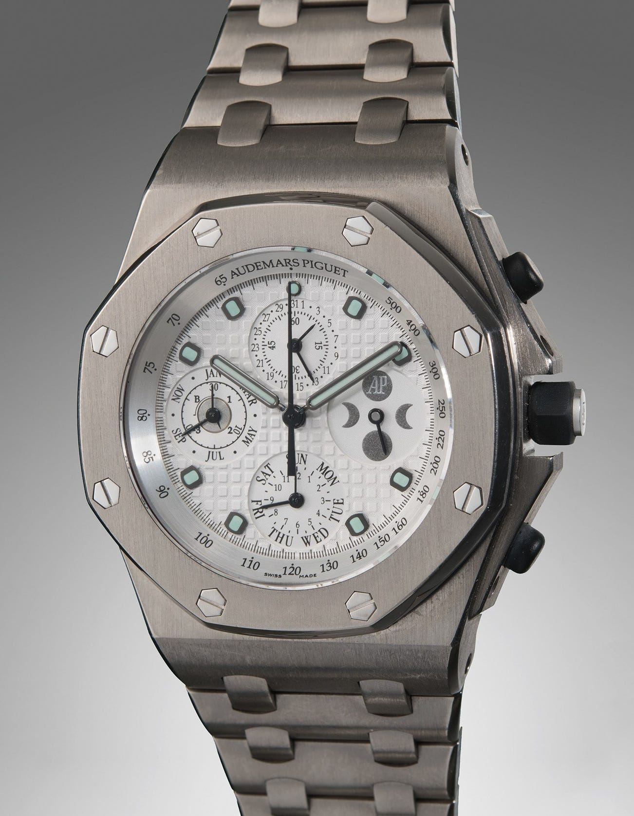 The present watch, featuring a prestigious perpetual calendar and moon phase indication in addition to a chronograph function, remains in excellent, unpolished condition and is offered complete with presentation box and its original guarantee. The grey “petite tapisserie” dial with original luminous hour markers and hands is the essence of the Offshore and makes a wonderful addition to any collection of sports watches. It has a direct historical link back to the original Royal Oak, and is a watch that can be comfortably worn both day and night, at the office or sailing in the Mediterranean during the summertime.