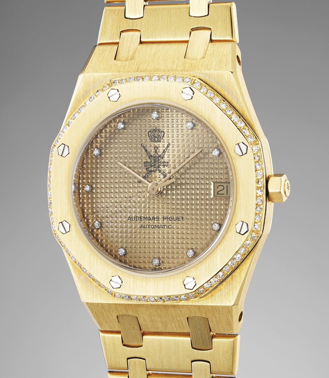 The Royal Oak in gold with outer bezel elegantly surmounted with diamonds was most certainly gifted to a high ranking official or to a very important foreign dignitary.