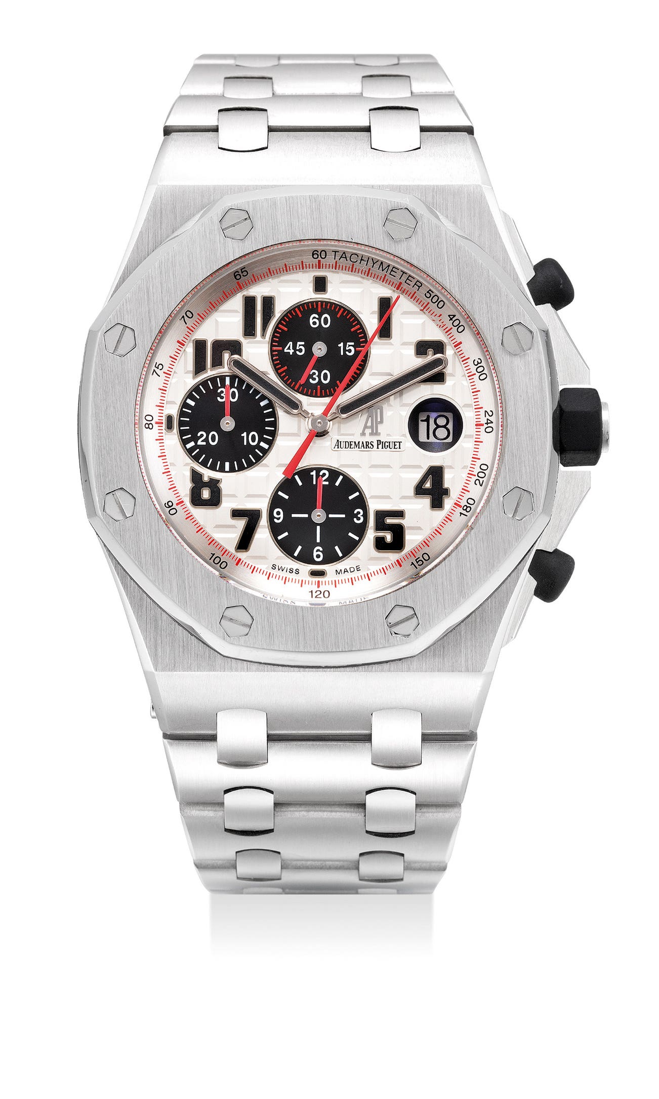The present example is an Audemars Piguet Royal Oak Offshore chronograph in stainless steel and fitted with an attractive “Panda” dial with red accents. The present watch still features rubber crown and chronographic pushers before the transition to ceramic crown and pushers in 2015. Presented in excellent overall condition and complete with the full set of accessories. This present example is a fantastic opportunity of Royal Oak collectors to acquire an attractive variant of the famed model.