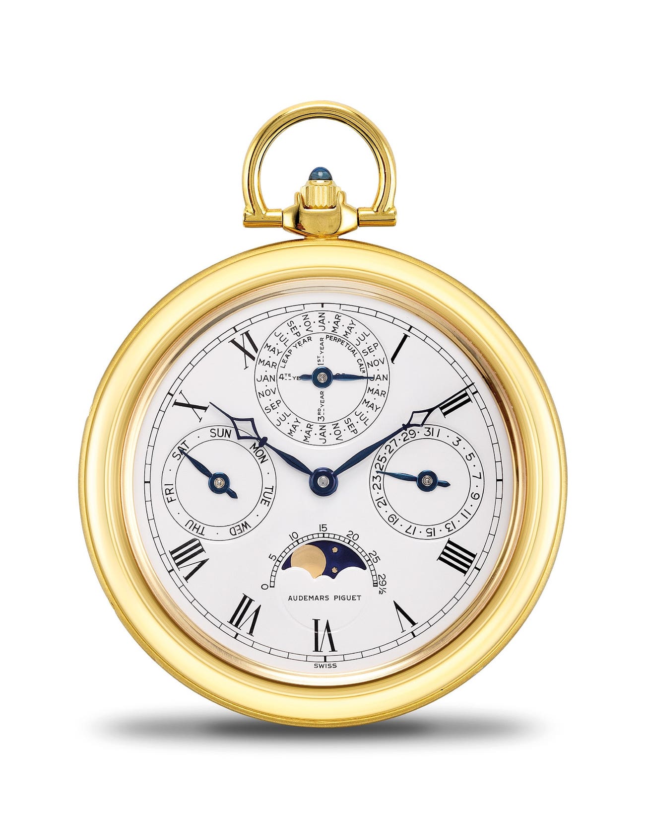 A fine and elegant yellow gold savonette openface pocket watch with perpetual calendar and moonphases