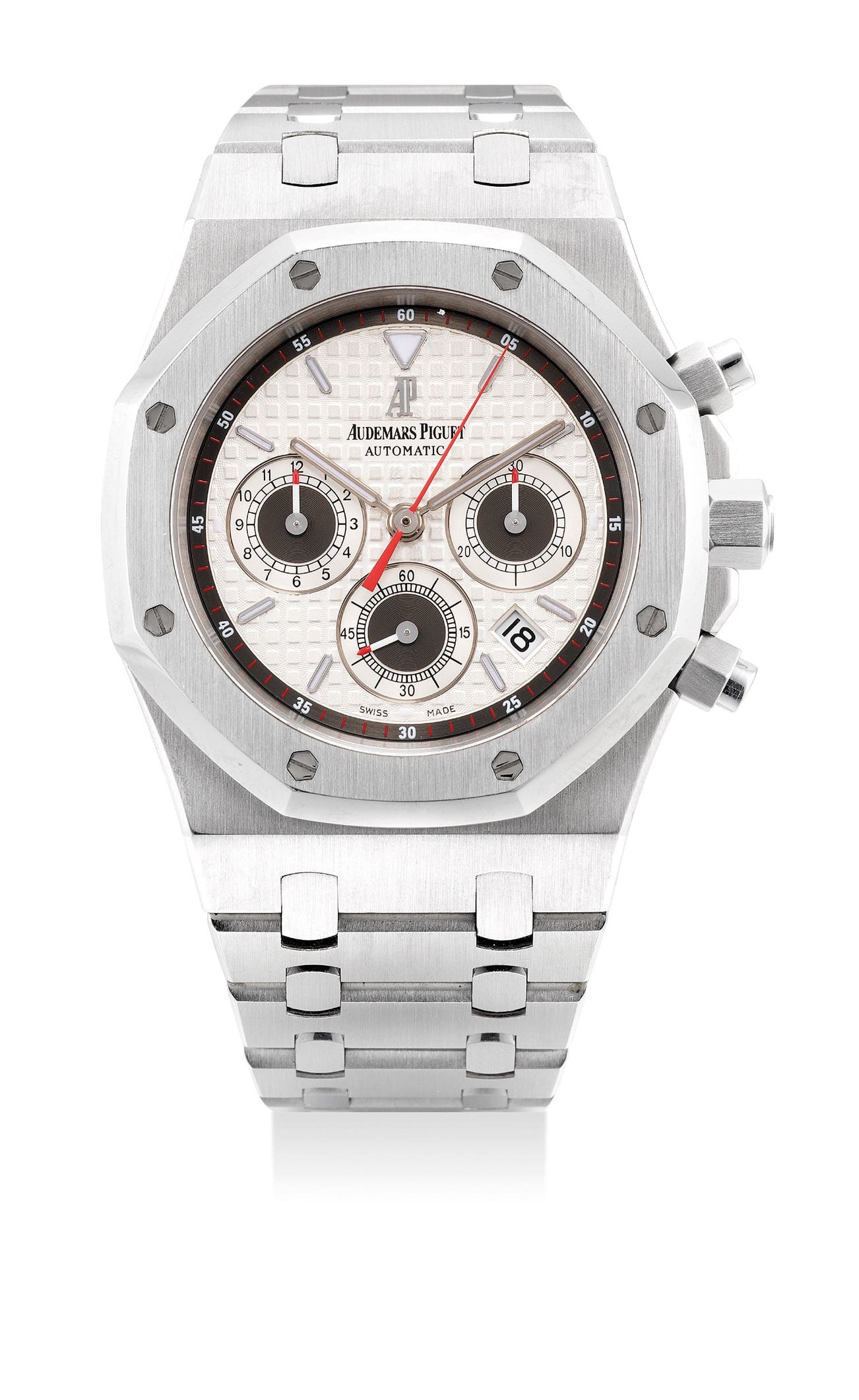 The present example featuring a rare and appealing “panda” dial with attractive red accents measures at 39mm in case diameter. Preserved in excellent overall condition with very minimal signs of wear, the discontinued model is a fantastic iteration and a specimen of the much loved Royal Oak featuring a chronograph complication.