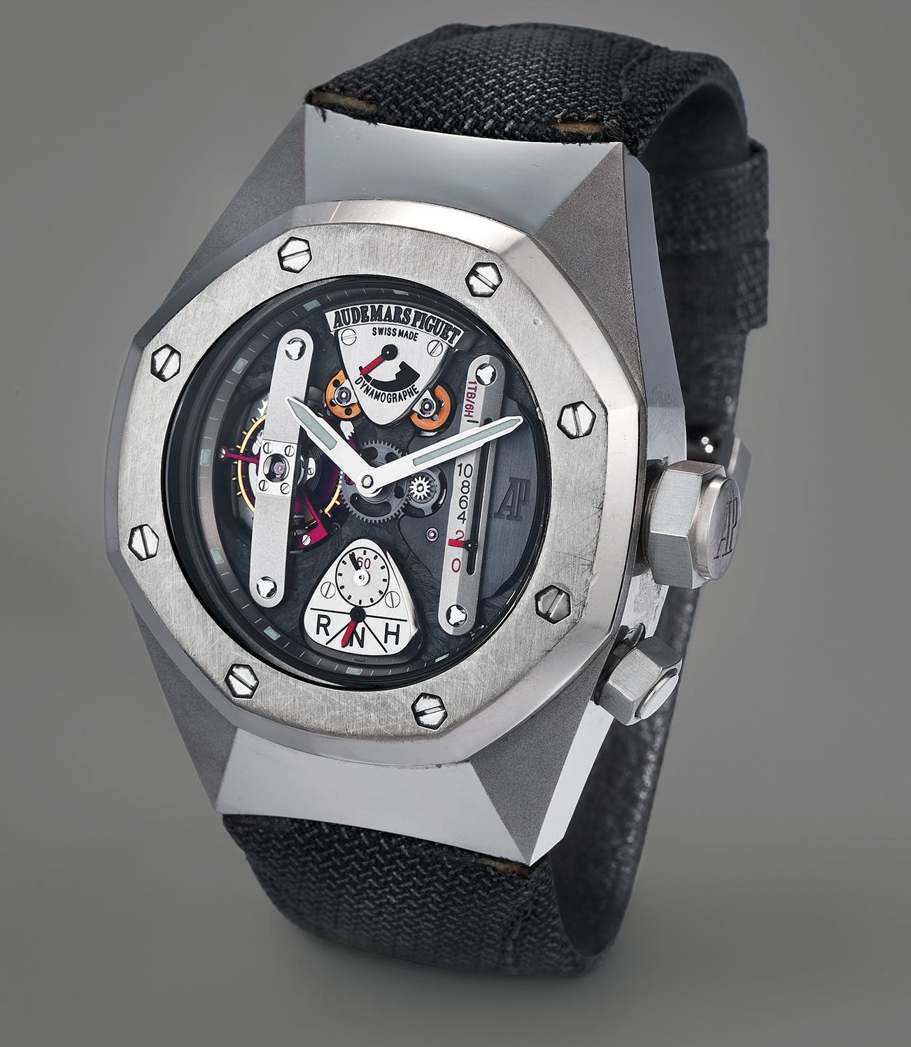 The concept watch was built to demonstrate the brand’s technical prowess and master craftsmanship, as well as illustrate cutting edge technical advances. It featured a case made of Alacrite 602, an innovative alloy of cobalt, chrome, tungsten, silicon and iron, that was never again used in any other watch. The robust, angular case’s design roots are clearly the same as the original Royal Oak from 1972, enlarged to a 44mm diameter with sharp facets and two sapphire crystals so the movement is fully exposed. The movement by famed complication specialist Renaud et Papi features a three arm, red-colored tourbillon carriage, and on this “piece unique”, a solid balance bridge spanning the top and bottom of the dial side to secure the tourbillon-equipped escapement. At the 12 o’clock position, Audemars Piguet added a “dynamographe” to represent the quality of torque on the mainspring, and to its right is a unique linear power reserve indicator spanning the length of the dial from 1 to 5 o’clock. At 6 o’clock, a function selection indicator showing the current function of the crown: winding (R-remontoir), neutral (N-neutre) and setting (H-heures). Through the screw down push button at 4 o’clock, the watch is set to the desired function in order to wind or set the time. The back of the movement is fitted with uniquely engraved plaques with an image of the HMS Royal Oak, the British flag and Royal Navy pendant as well as maps of the Americas and Asia.