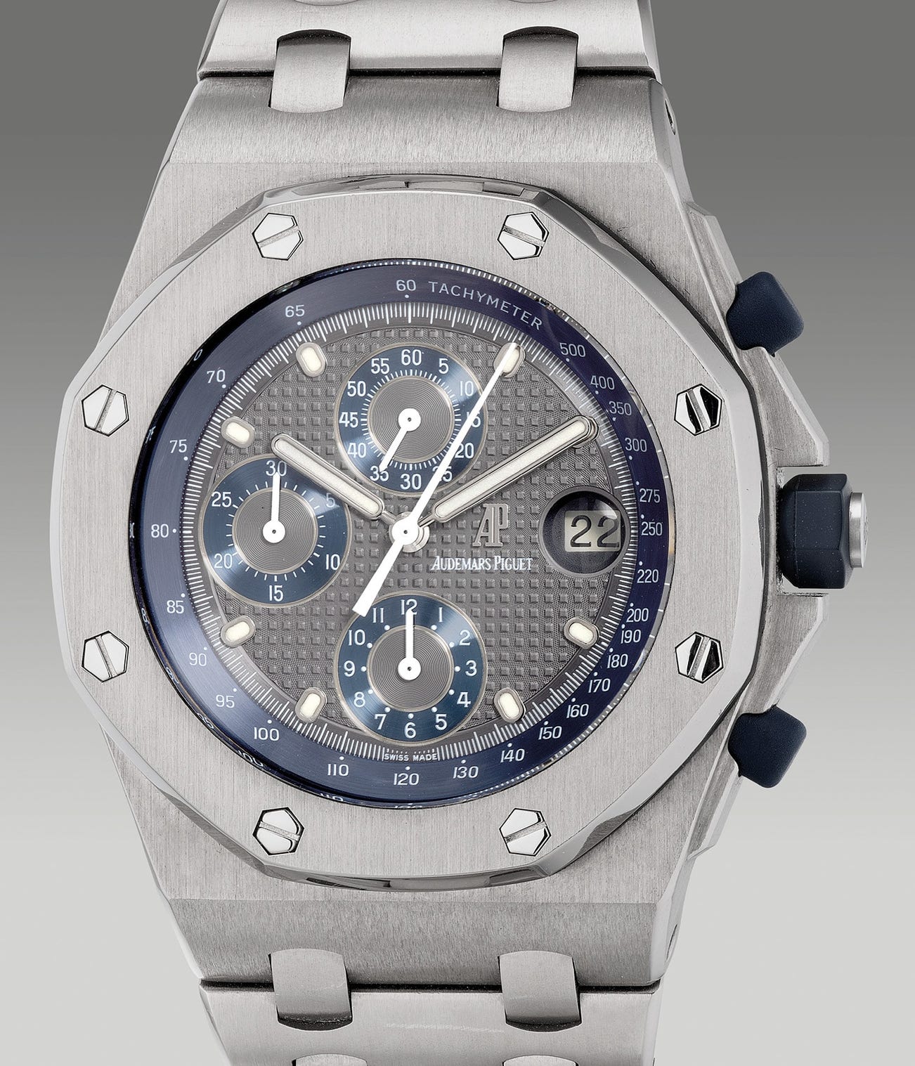 Exuding a cool and icy charm, the present Royal Oak Offshore, fitted with an ashen grey tapisserie dial, confidently conveys a robust sense of boldness. The present watch is furthermore preserved in an overall excellent condition. A combination of great technical prowess, top-notch material and daring design, the present lot, completed with original warranty, is not simply a luxury sports wristwatch but also a grand attention-grabber.