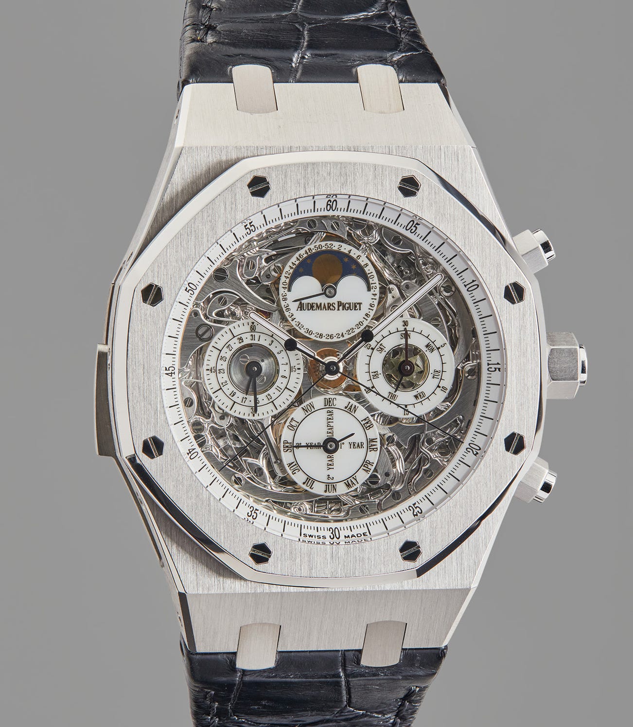 An extremely rare and impressive white gold minute repeating perpetual calendar split-seconds chronograph skeletonized wristwatch with leap year and week indication, moon phase with Warranty, Extract, two presentation boxes, “piano” resonance box, donated by Guy Laliberté, sold to support the missions of One Drop and the Prince Albert II of Monaco Foundation.