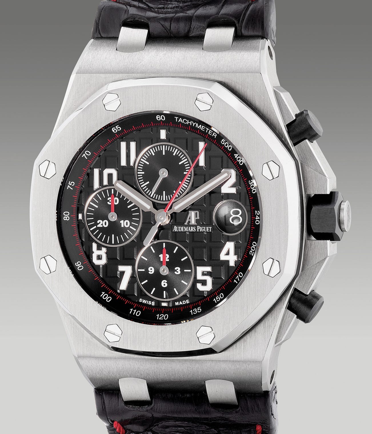 In 2015, Audemars Piguet upgraded the model and introduced the ref. 26470ST.OO.A101CR.01 with new ceramic chronograph pushers and crown to ensure durability. The present example with red and black ascents belongs to one of the first introduced in 2015 at Watches and Wonders paired harmoniously with a black hornback alligator strap with red stitching. Presented in excellent overall condition with only having been worn no more than a handful of times and presented with the full set of accessories, it is certainly a perfect wristwatch for the weekend cruise.