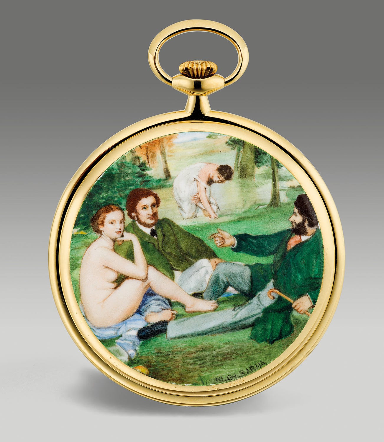 A rare and very fine yellow gold open face pocket watch with enamel miniature painted by Ni. Gi. Barna, after a painting by Édouard Manet "Le Déjeuner sur l'herbe"