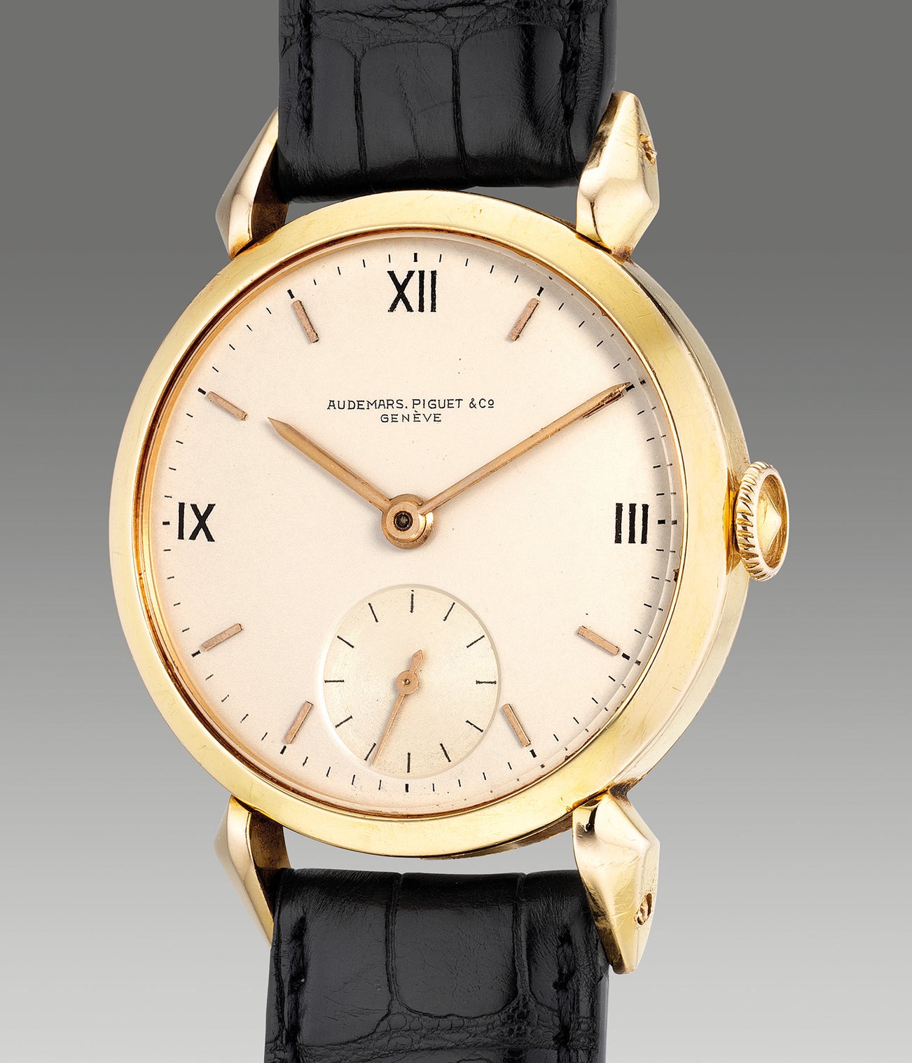 Part of the early era, the present timepiece is presented with an unusual configuration. Most notable is its unconventional faceted lugs, also known as the spider lugs due to its resemblance and silhouette of an arachnid. The case back is further stamped with the mark of French Jeweller, Mauboussin, congruent with the eagle head hallmark stamped on the inside case back, commonly seen on French made gold jewellery. Distinguished with an elegant art deco appeal, this time-only specimen offers the art of simplicity with a subtle touch of allure, and is surely an appealing and desirable honest example for vintage collectors.