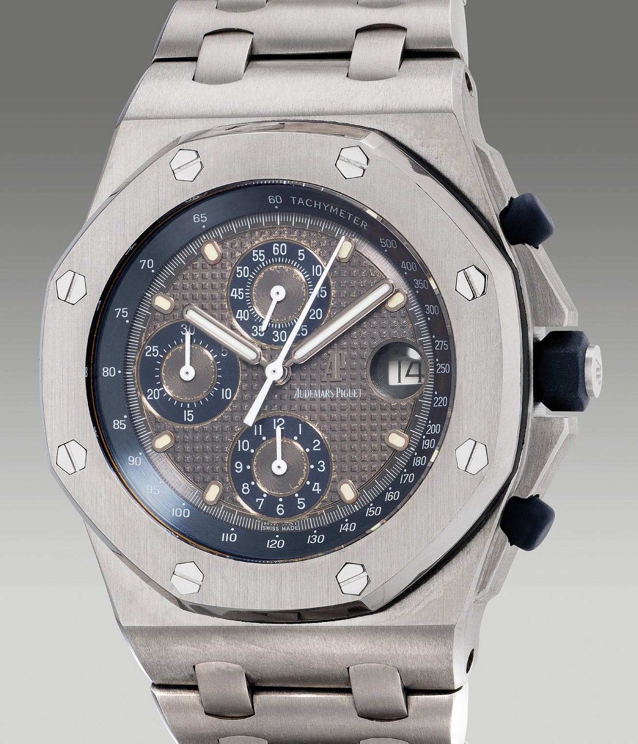 In 1998, Audemars Piguet released a series of Royal Oak Offshore chronographs made in titanium which was released after the scarcely produced platinum Offshore. With a contrast, the Titanium Offshore was one of the lightest examples of the model produced with two dial variants, ashen gray and a white dial with blue registers. The reference was discontinued in 2003.