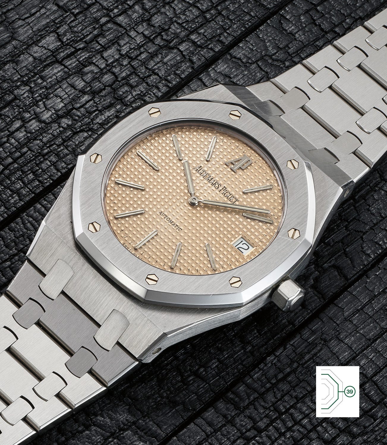 A time capsule, the present watch is distinguished by its most probably unpolished condition. All contrasting polished and brushed finishes remain intact, and show how a "factory spec" reference 14802 looked like when it left the factory. The salmon dial remains vibrant with barely any sign of aging - Audemars Piguet has even taken inspiration from this very model in its contemporary catalog with the reference 15202BC. Furthermore, all original accessories are present - even the original certificate and numbered box, indicating that the present watch is part of the Jubilée series.