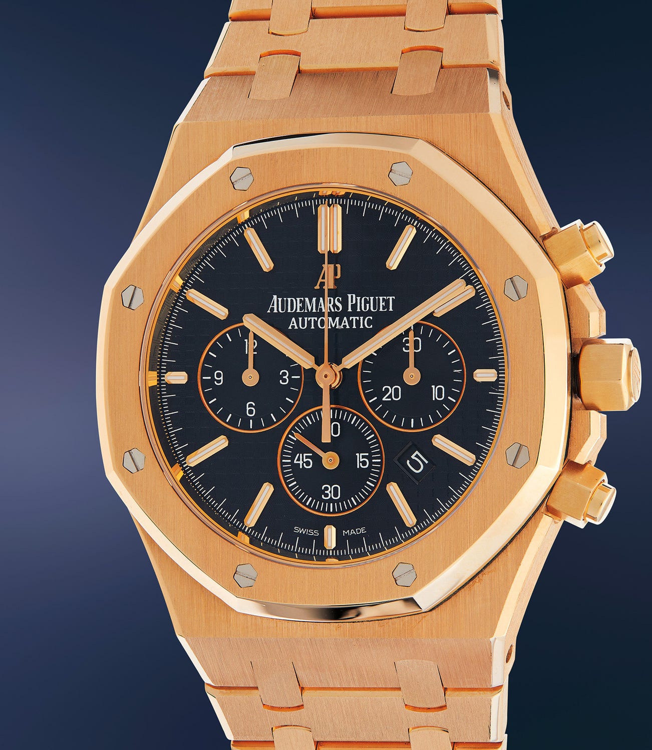In 2008, Audemars Piguet replaced the reference 25860 with the introduction of the Royal Oak reference 26320 - a redesigned model featuring a three-piece case similar in construction to the brand’s Offshore collection. Now discontinued, the successor reference updated the case diameter to 41mm, but the 40mm case of the 26320 is by no means diminutive. With its charismatic, glossy black grande tapisserie dial and pink gold luminous markers, it is both an impressive and masculine chronograph wristwatch.
