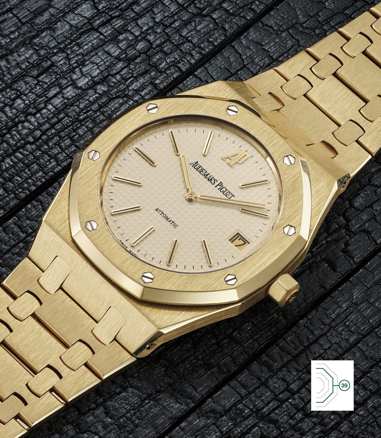 The present yellow gold reference 14802 is beautifully complemented by an incredibly attractive ivory color dial. Audemars Piguet pushed the refinement even further by including a golden date disc to echo the aesthetics of the case and indexes, a subtle but important detail. This combination adds a lot of light and shine to the watch and gives it a “Miami Vice” look.