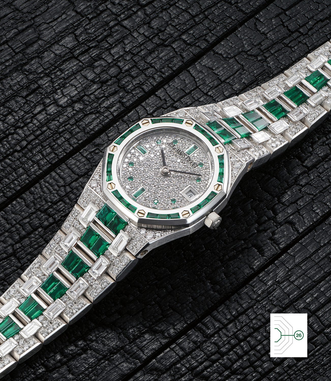 An impressive and lavish white gold, diamond and emerald-set wristwatch with date and bracelet