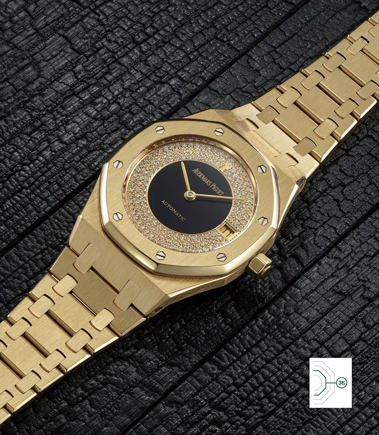 Gem-set Royal Oak timepieces are exquisitely uncommon, but even more uncommon are Royal Oak watches fitted with hardstone dials. Thus, the present watch can be considered an absolute rarity, given that it incorporates in its dial both diamond-pavé and onyx. The aesthetic result is as powerful as the watch is scarce; the shimmering of the diamonds finds its polar opposite in the pitch black central onyx disc, with the result that both materials mutually reinforce each other’s presence.