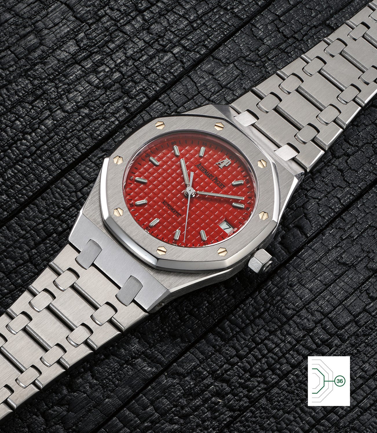 A representative of the 3rd Series, the present piece is obviously distinguished by its extremely attractive red dial. In fact, a restricted number of watches were fitted with brightly colored dials. It goes without saying that their carefree modern looks coupled with their absolute scarcity propelled any such piece to the pinnacle of Royal Oak collecting. For the joy of the most demanding collector, Phillips is proud to be able to offer an example of each of the three colors produced: red, blue and yellow making this a virtually unique occasion to be able to create from scratch a mind-blowing 3-watches collection.