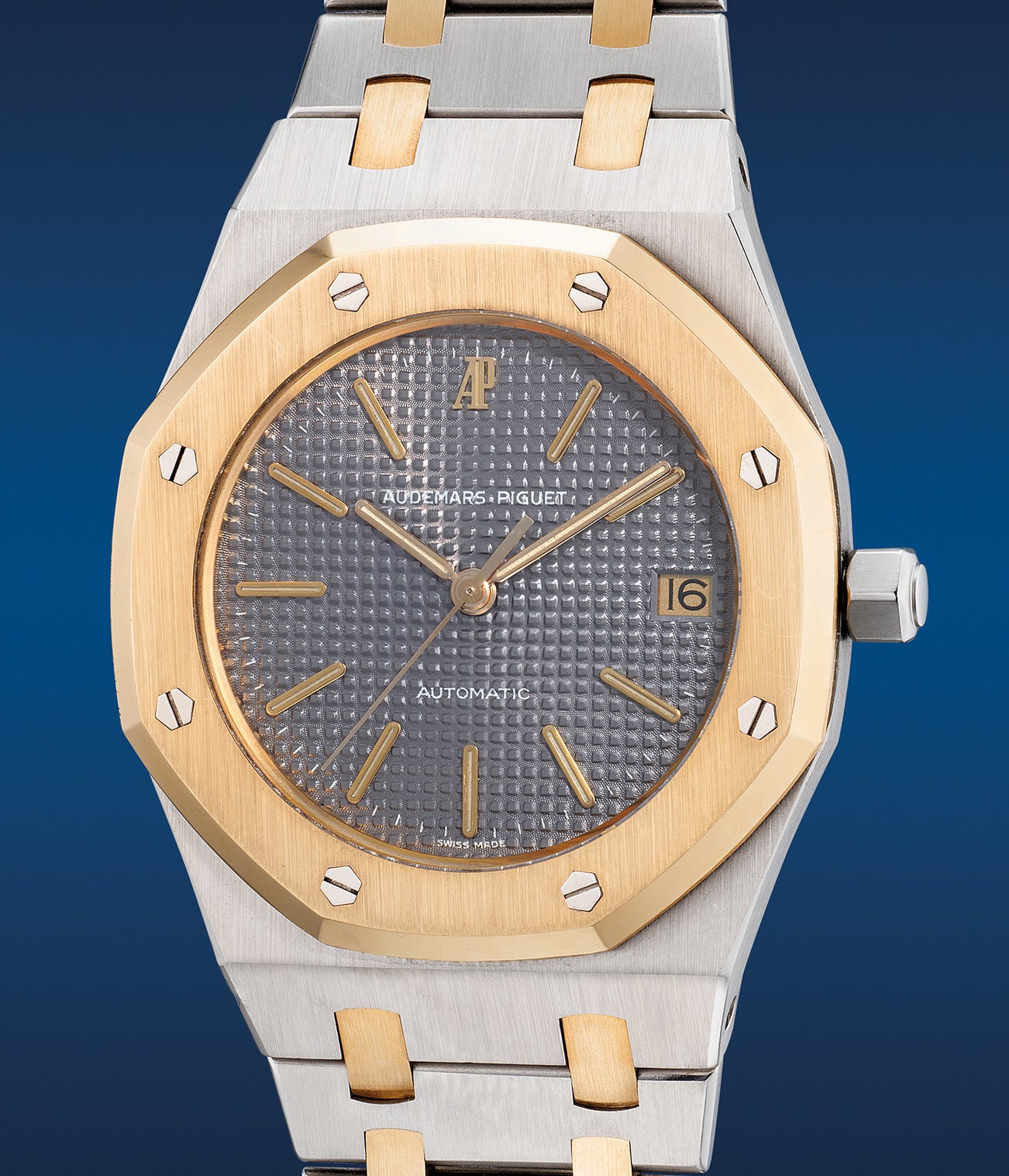 From 1983 in the midst of the golden era of two-tone timepieces such as the Patek Philippe Nautilus and the Vacheron Constantin ref. 222, the present Audemars Piguet ref. 14332 also ride on this new trend with an upsized 36mm case. Robust in steel with a well-balanced of rich yellow metal that accentuates the design of a luxury sports timepiece, the aesthetic of the iconic tapisserie dial stayed much like its sibling ref. 4100, featuring the early Audemars Piguet signature at 12 o’clock and flat top “A” in automatic signature at 6 o’clock, the ref. 14332 is signed SWISS MADE instead of SWISS on the ref. 4100. Extremely well-preserved, the present example is from 1987 confirmed by the Audemars Piguet Extract from the Archives. Fitted with an attractive grey dial with warm gold date wheel that perfectly complements its case metal, the present ref. 14332 also retains its original unsigned crown correct to the period. With a celebration of the 50th anniversary of the Royal Oak this very year, the present two-tone ref. 14332 with incredible vintage aesthetics synonymous to the period is a perfect daily watch for the discerned collector.
