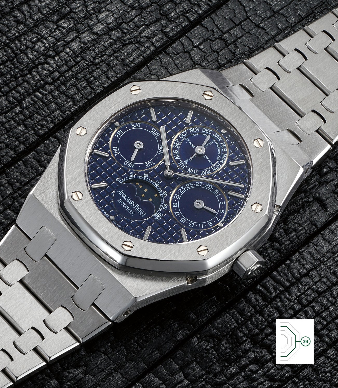 The Royal Oak Perpetual Calendar, released in 1984, was powered by the world's thinnest renowned cal. 2120/2800 with a Jaeger-LeCoultre base and was a total revelation, contributing to the overcoming of the quartz crisis. From 1984 to 1993, early examples of the model showcased a dial without a leap year indicator, whereas subsequent models from 1993 onwards have a leap year indicator. In 1995, the reference 25820 debuted, powered by the cal. 2120/2802 with leap year indicator like the present example. The casing is still distinctive and traditional in form, measuring a comfortable 39mm in diameter and being kept thin. The current stainless steel model has a lovely and appealing dark blue tapisserie dial and is furthermore in excellent condition. The large tapisserie adds another level of complexity and sportiness to the timepiece, making this a terrific opportunity for collectors to obtain an iconic perpetual calendar wristwatch from Audemars Piguet.