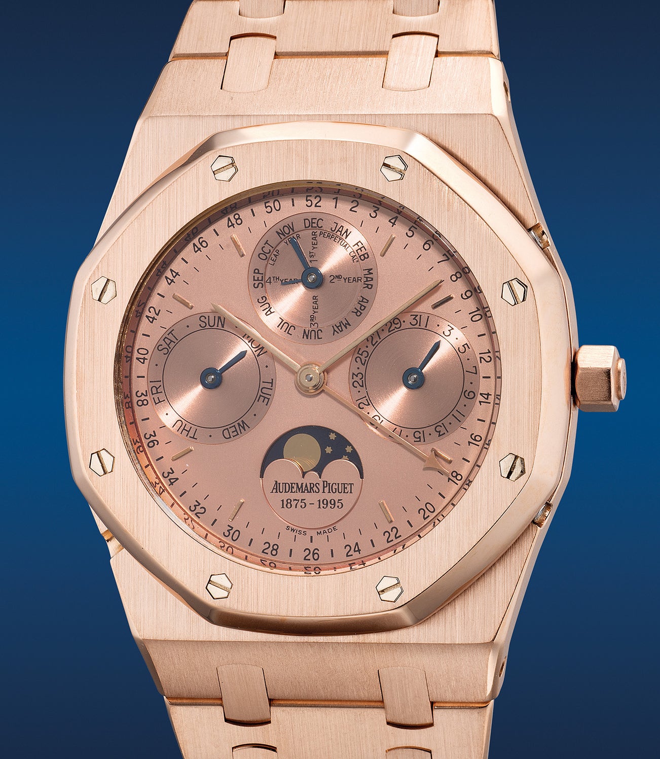 A very rare and attractive limited edition pink gold perpetual calendar wristwatch with moon phases, leap year indication and bracelet, part of a 120 pieces limited edition made to commemorate Audemars Piguet's 120th anniversary