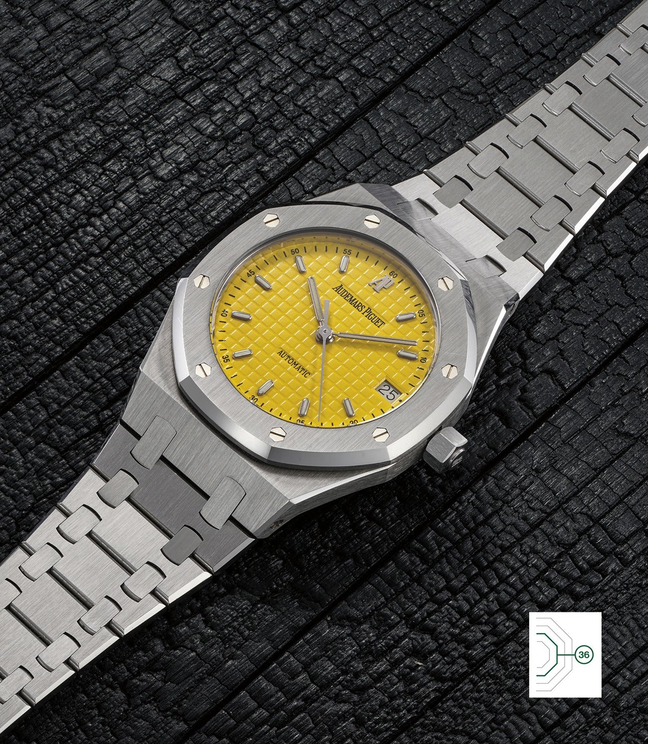The present reference 14790 very visibly differentiates itself by its canary yellow dial. When it was launched in 1992 the model was presented in very traditional combinations; later, a small batch was launched sporting the three primary colors: Red, Blue and Yellow. We are indeed very honored to present the three colors together with lots 12 and 81. In addition to being radically modern with a "Grande Tapisserie" pattern and small indexes, the addition of color quite uncommon within the Royal Oak collection adds immense panache to this watch. According to research, yellow is the rarest dial color of the reference.