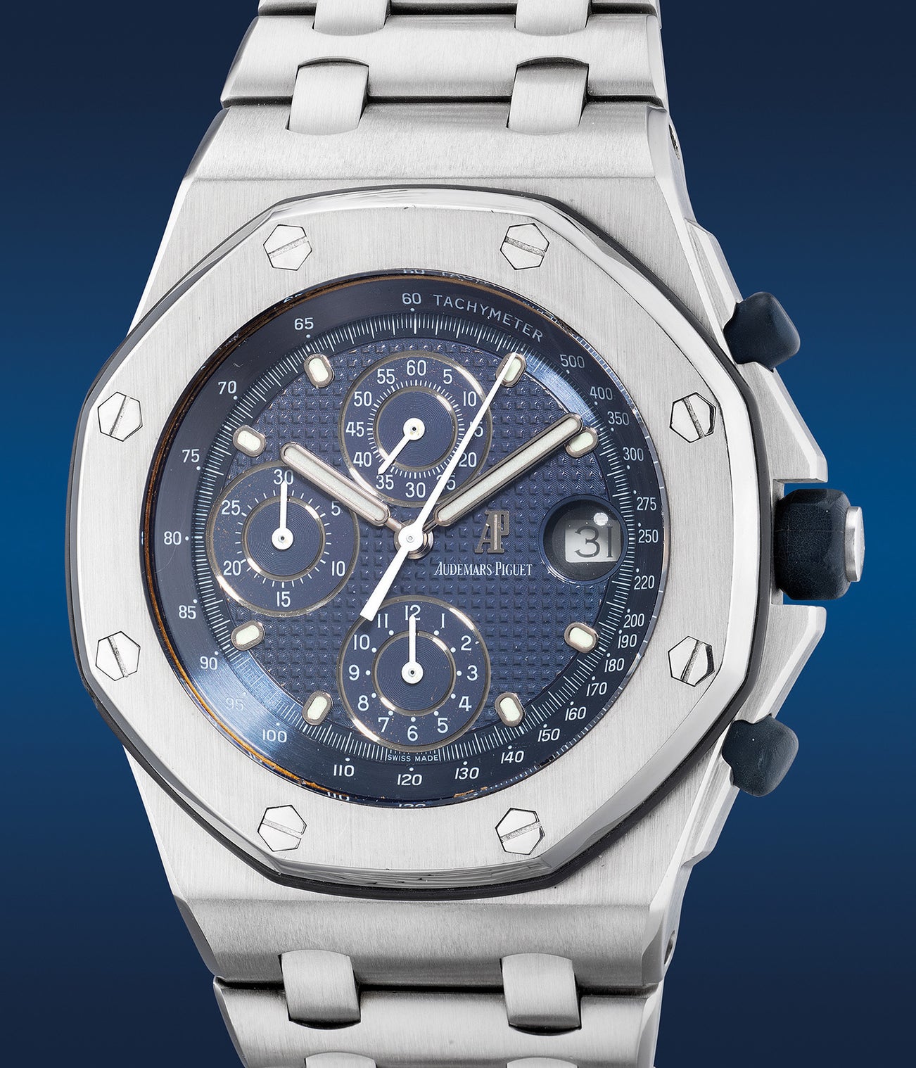The present Royal Oak Offshore ref. 25721ST is a rare gem itself as it features a beautiful rich blue dial that has developed light signs of tropical speckles naturally over the years. The present example from the E series belongs to the second series of the reference produced. Accompanied by the original guarantee and presentation box, the present example is also preserved in attractive overall condition.
