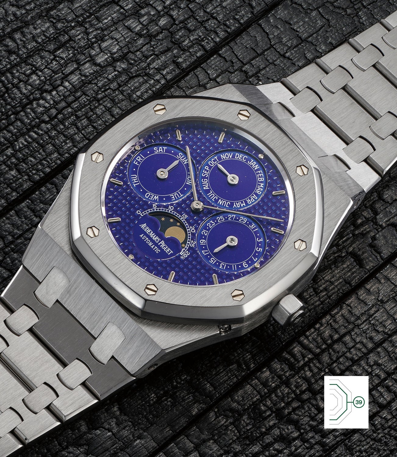 When the beauty and rarity of the "Sapphire Blue" (aka, "Yves Klein") dial merges with the collectability and historical appeal of a "no leap year" perpetual calendar Royal Oak, one knows without a doubt that one is in the presence of a wristwatch that is as eminently collectible as it is strikingly charming.