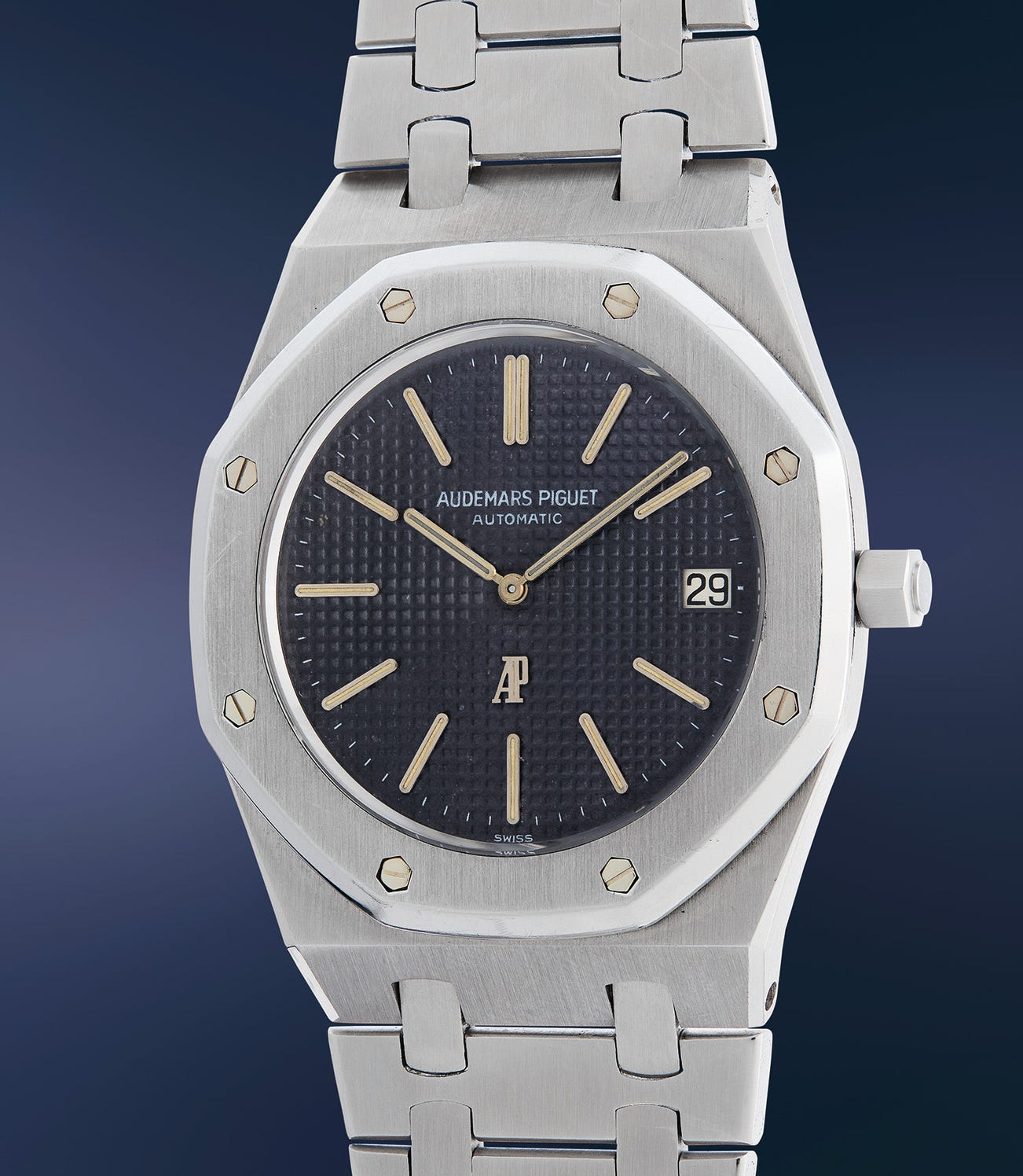 The ‘A’ series Royal Oak models feature the distinctive ‘AP’ logo positioned at 6 o’clock, with later “Jumbo” models having the brand logo at the 12 o’clock position. This superb A-series Royal Oak wristwatch from 1974, number A1745, is a charismatic example. Its 39 mm case diameter provides outstanding wrist presence, whilst its original Gay Frères stainless steel bracelet remains taut and wonderfully preserved. The case is well-preserved, and is most probably unpolished, while the original dial is beautifully aged with the hands and luminous hour markers having acquired an attractive, light yellowish hue.