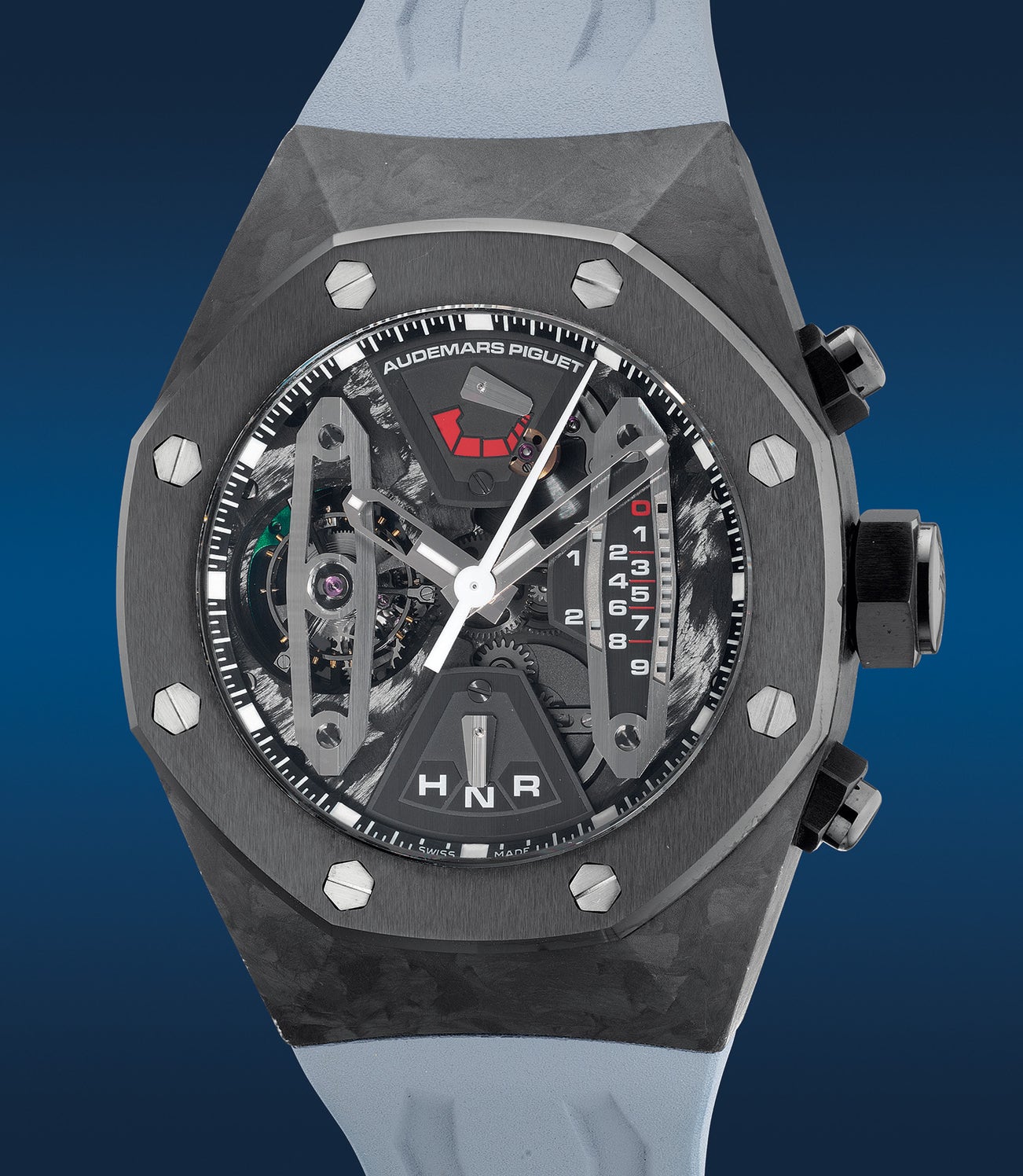 Prominently structured in a muscular, faceted form, the Royal Oak Concept Carbon CCW1 shows off a remarkable design with a multi-layered construct, which enables the wearer to admire the mechanical marvel through its dial. The charismatic dial features three key elements through its skeletonised construct: a 30-minute chronograph with a linear display, a dynamograph indication at 12 o’clock that signifies the quality of the torque in the mainspring, and finally, a function selector at 6 o’clock— R for remontoir (winding), N for neuter (neutral) and lastly, H for heures (hours). Powered by the cal. 2985, the sapphire window also exposes a tourbillon chronograph movement that offers an astounding power reserve of 237 hours, comprised of 388 components.
