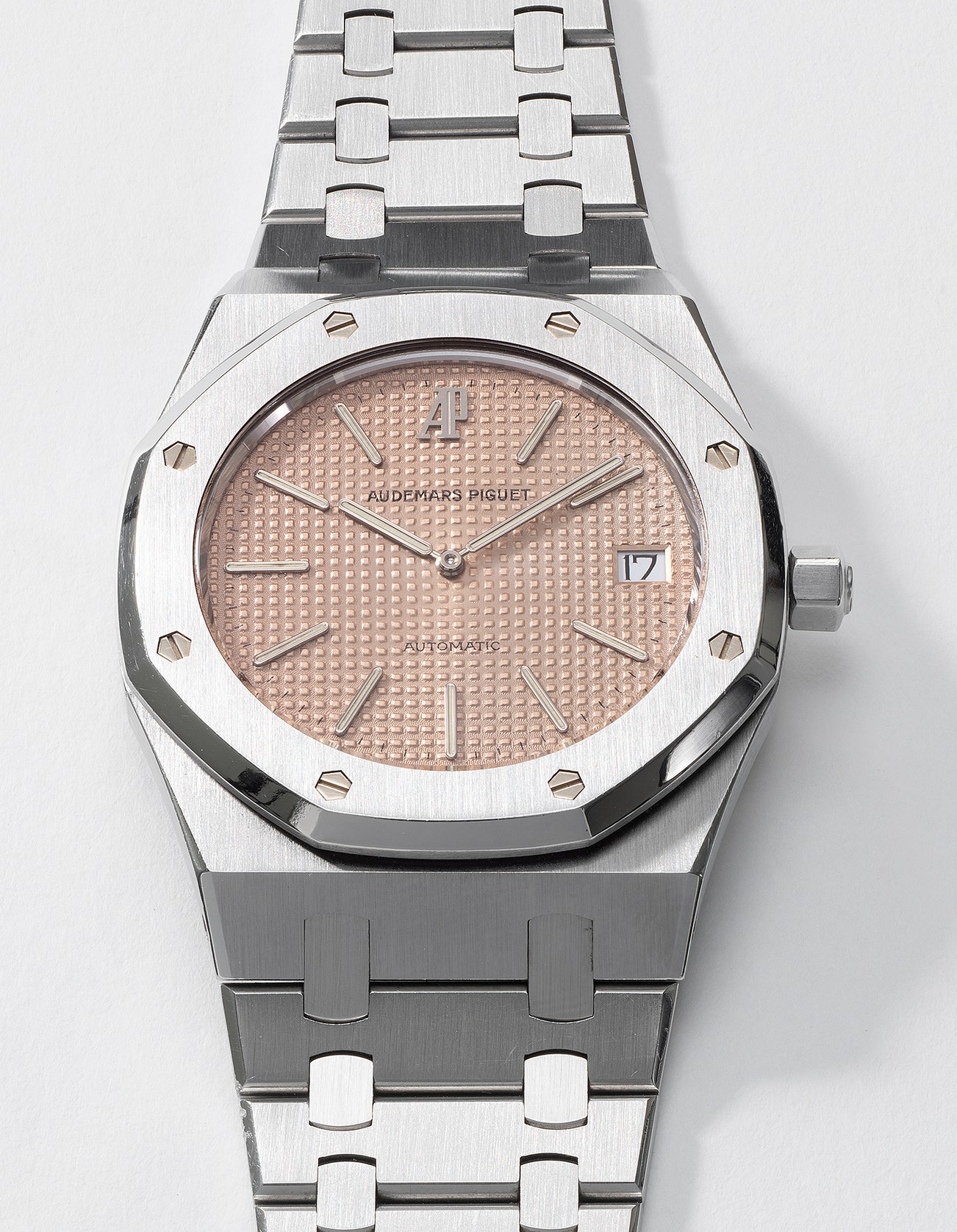 Numbered 622 of a limited edition of 1,000 pieces, the present watch is a time capsule distinguished by its well-preserved condition. All contrasting polished and brushed finishes remain intact while the luminous hands and indices have aged uniformly to an attractive ivory patina that compliments the vibrant salmon dial. Audemars Piguet has even taken inspiration from this very model in its contemporary catalog with the ref. 15202BC. Furthermore, all original accessories are present including the original certificate and a numbered octagonal presentation box reminiscent of the octagonal screwed bezel of the Royal Oak itself.