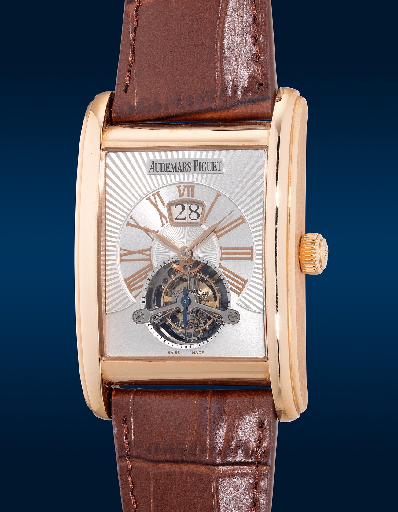 - In addition to the marvel of the tourbillon, the dial is further decorated with a guilloche pattern and roman numeral indices. A large date window at 12 o’clock ensures legibility at a glance.
