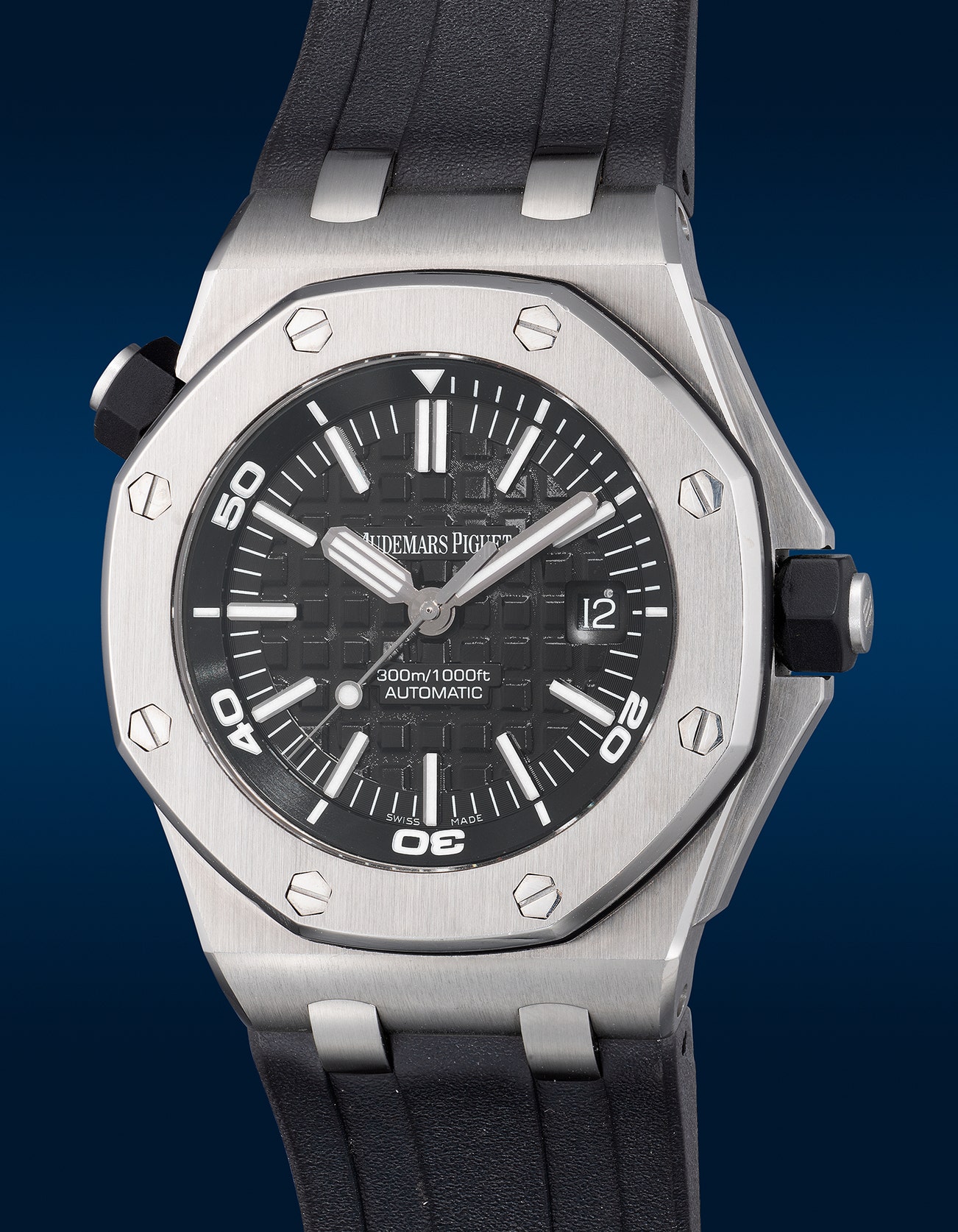 - While originally engineered for deep-sea divers, this Royal Oak Offshore Diver proves equally suited to any well-appointed adventure or formal soiree. When only the finest maritime-inspired timepieces will do, the present ref.15703ST is the undisputed champion, preserved in excellent condition with its full set of accessories. This robust yet refined beauty delivers performance as deep and multi-dimensional as the open ocean itself.