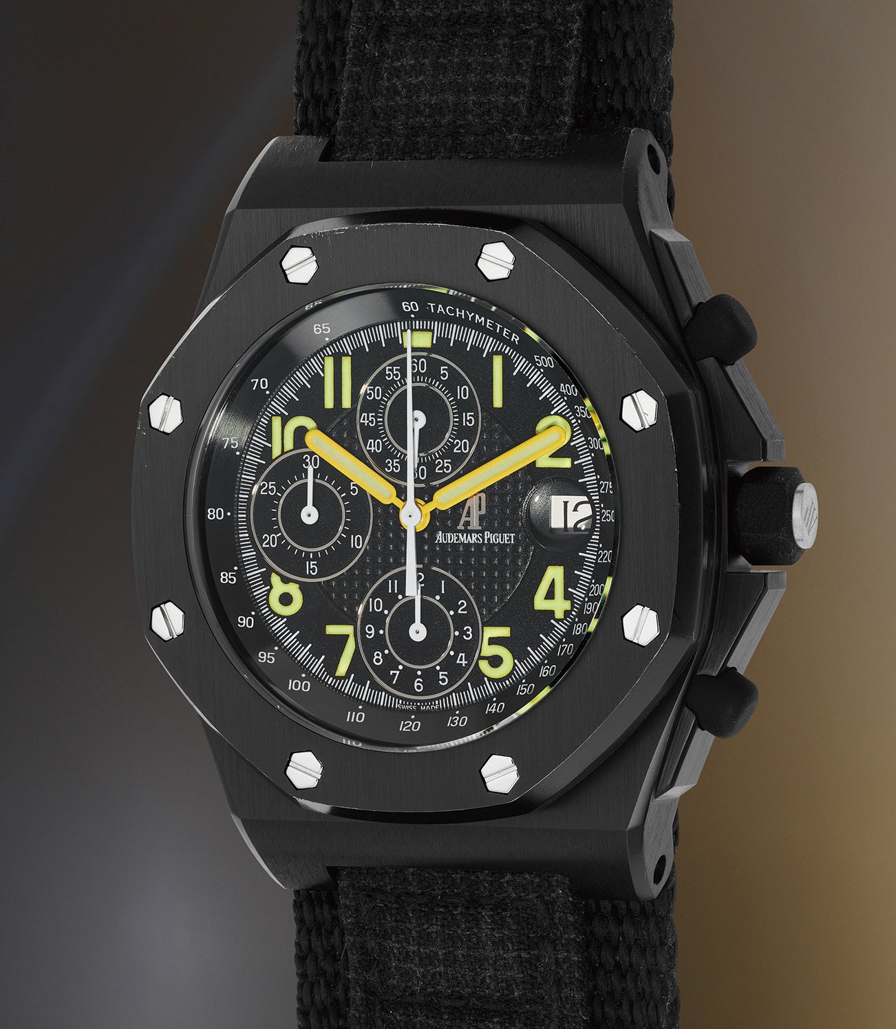 The “End of Days” Royal Oak Offshore chronograph was launched as a limited edition of 500 pieces in 1999, marking the beginning of a new millennium. With a PVD-coated stainless steel case, the watch is fitted with a black dial featuring zesty yellow luminous numerals and hands. This End of Days Offshore was serviced by Audemars Piguet in 2019, and it comes with its original certificate of origin dated May 13, 2000.