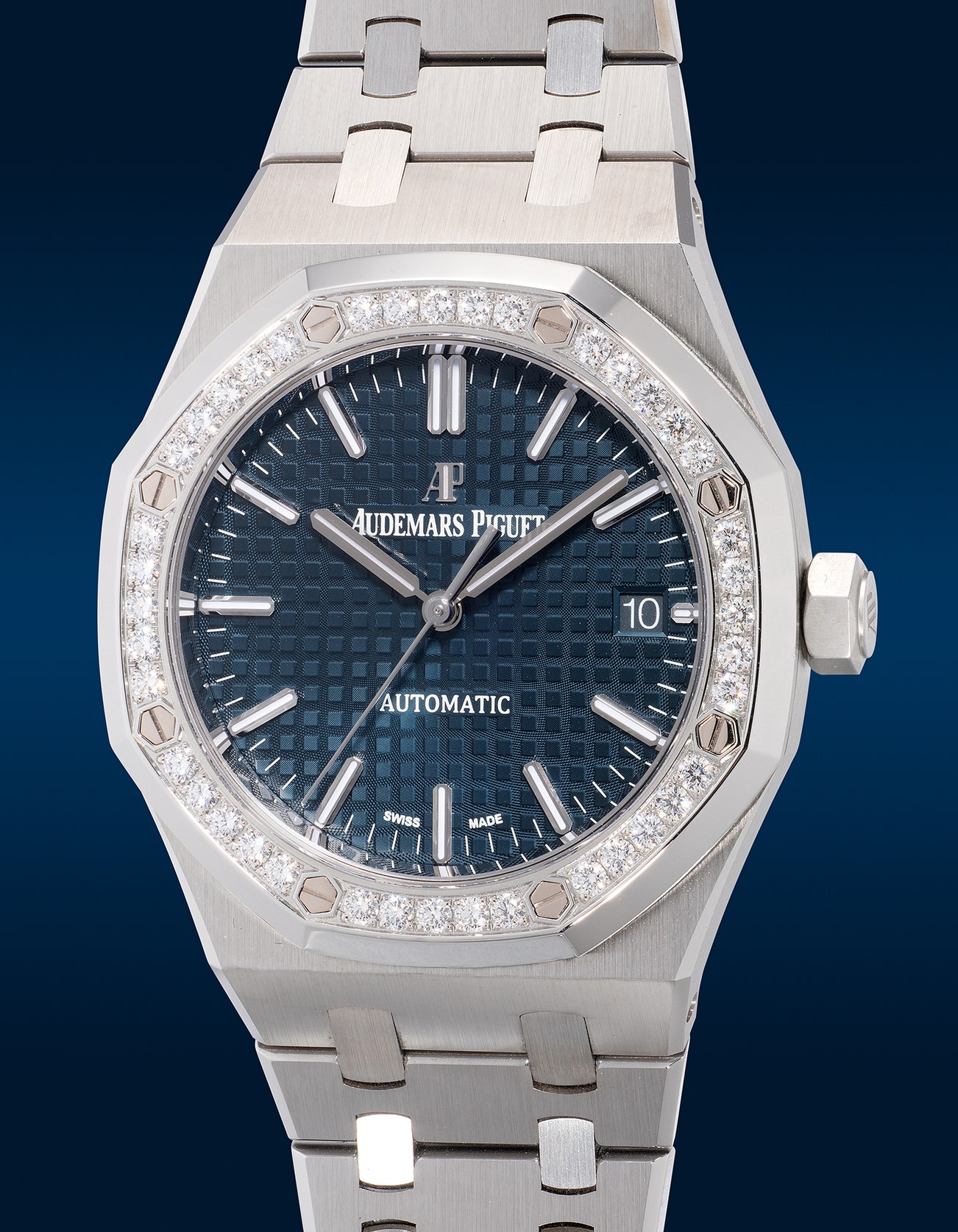 - Continuing the legacy of its predecessor, the ref. 15451ST appeared as a mid-sized 37mm diameter option in the Audemars Piguet catalogue. This three-handed timepiece is a Royal Oak through and through. Incorporating its core aesthetical DNA, it features the iconic multi-finished stainless steel case and bracelet, matched with a blue grand tapisserie dial and bedazzled with a gorgeous diamond-set bezel.