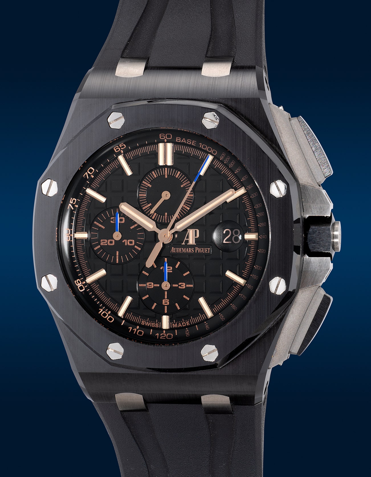 - Crafted with a perfect blend of durability and contemporary style, the 44mm diameter of the Royal Oak Offshore exudes a sophisticated and masculine appeal. This black ceramic model is particularly striking and sporty, featuring a black mega tapisserie dial with contrasting pink gold accents. The titanium caseback adds both sturdiness and lightweight qualities, ensuring a comfortable wearing experience without sacrificing wrist presence.