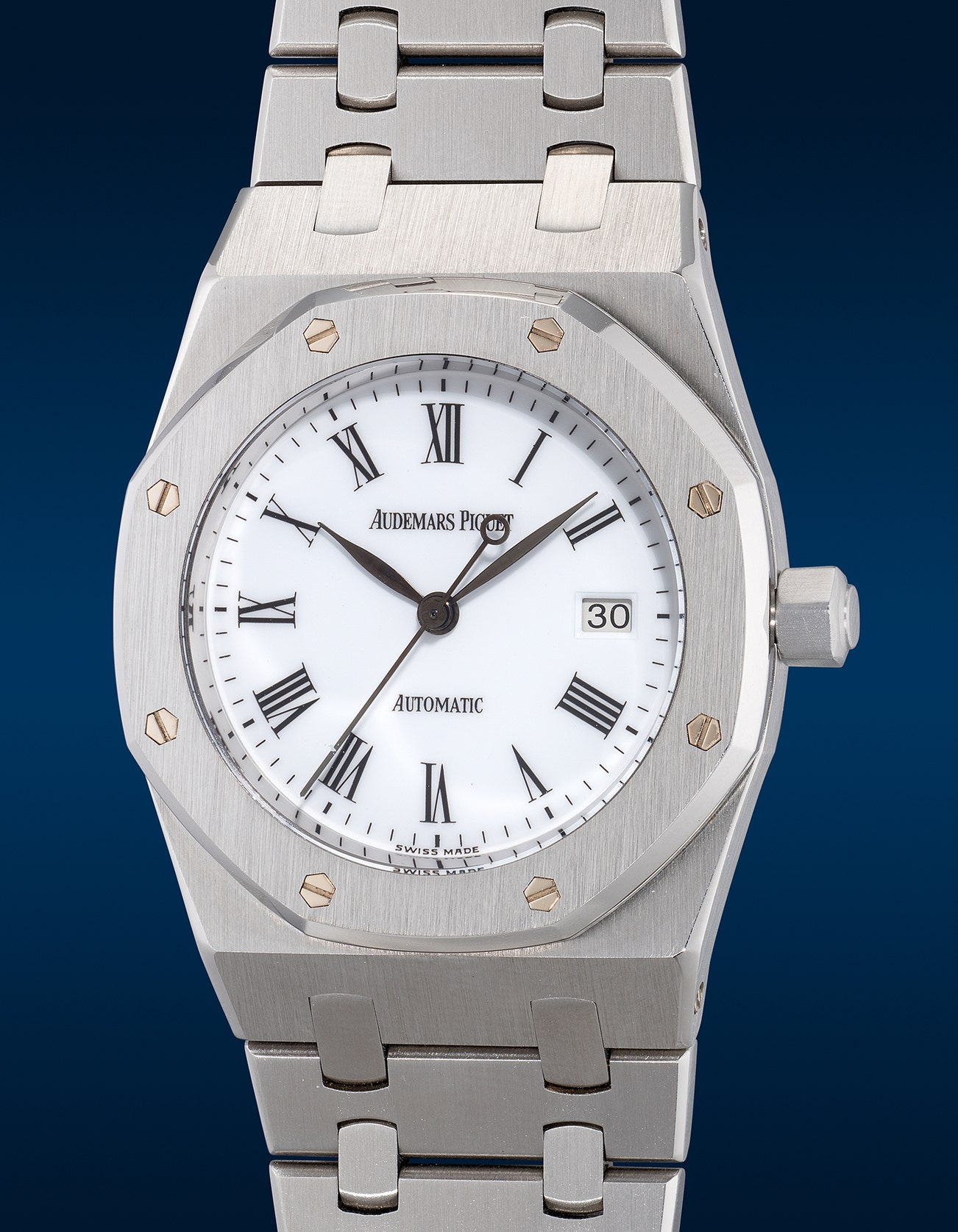 - Combining sportiness with elegance, this watch comes complete with its accessories. It presents a rare opportunity for Royal Oak enthusiasts to add a sleek example to their collection.