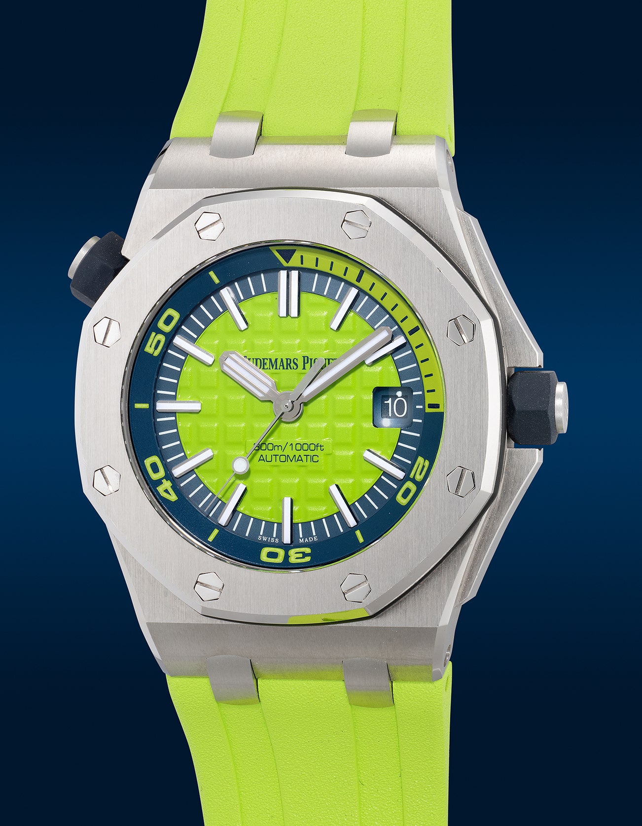 - The present example showcases a striking lime green dial that is perfectly complemented by a matching rubber strap, making it an ideal choice for a hot summer day. It is worth noting that the white and green variants of this collection are exclusively available in Audemars Piguet boutiques. Together with all the accessories, this presents an opportunity to acquire one of the most playful releases from Audemars Piguet.